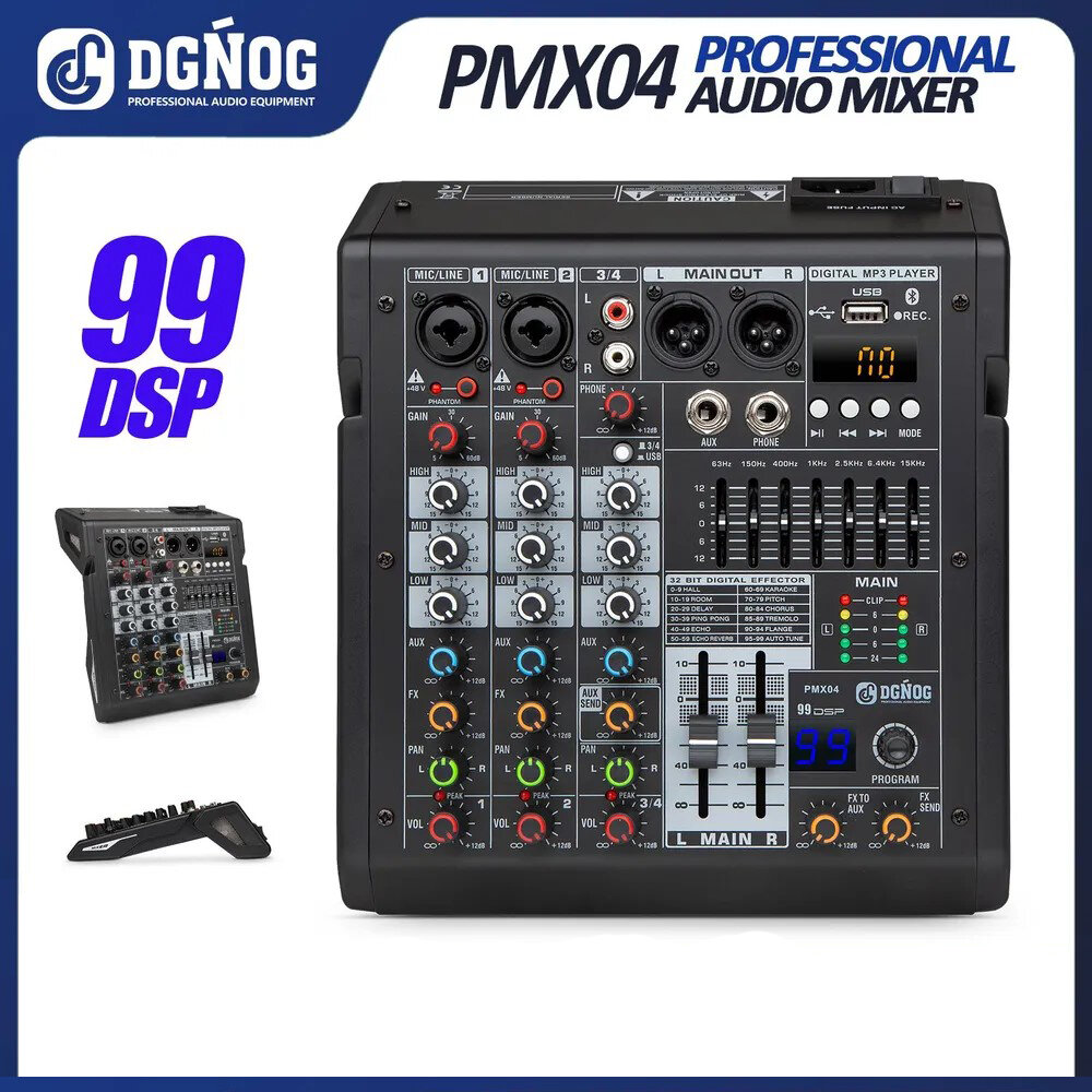 Купить 4-канальный Микшерный пульт DGNOG PMX04 цифровой MP3-вход, фантомное питание 48 В, с эффектом 99 DSP, 7-полосный эквалайзер