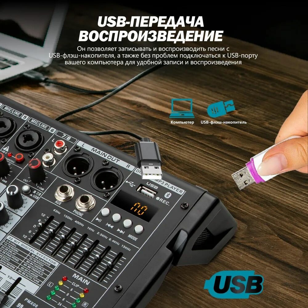 6-канальный Микшерный пульт DGNOG PMX06 цифровой MP3-вход, фантомное питание 48 В, с эффектом 99 DSP,7-полосный эквалайзер