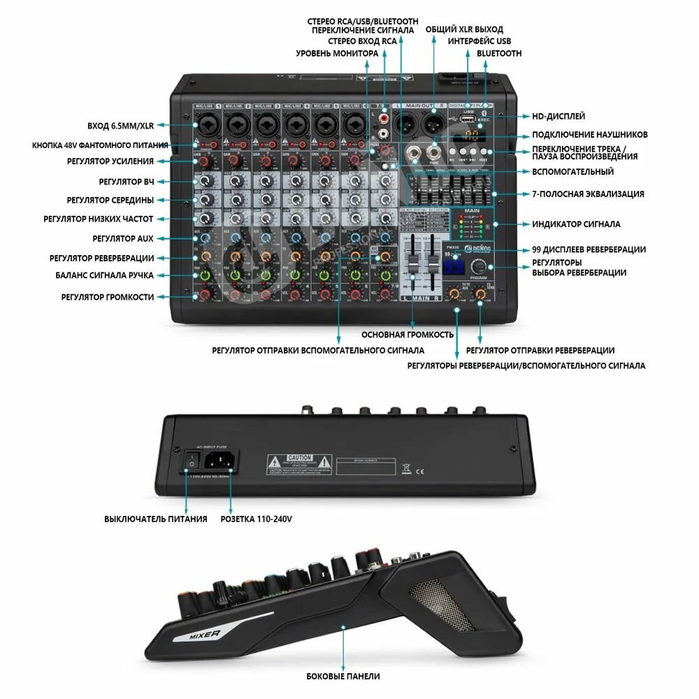 8-канальный Микшерный пульт DGNOG PMX08 цифровой MP3-вход, фантомное питание 48 В, с эффектом 99 DSP,7-полосный эквалайзер