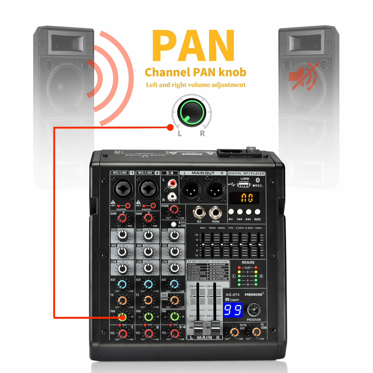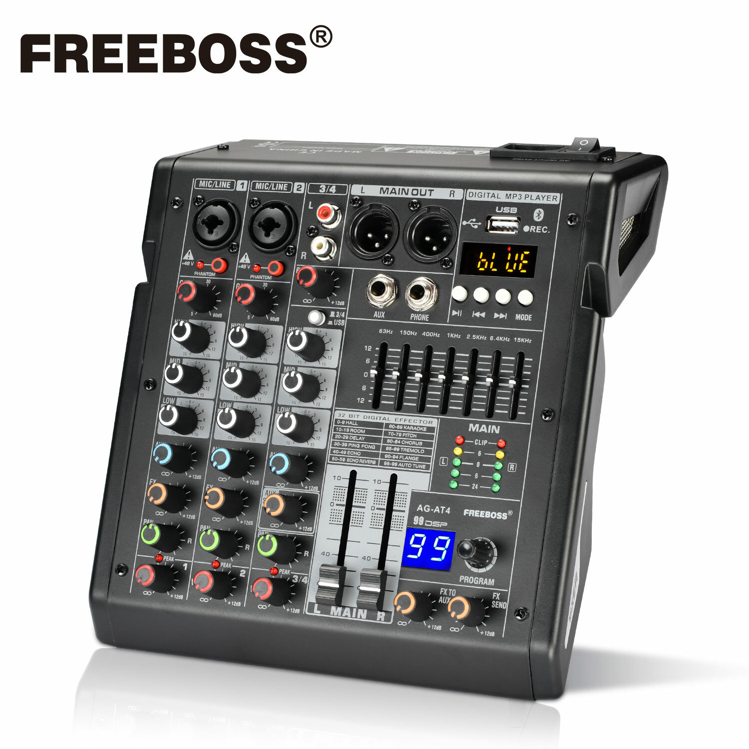 Аудиомикшер 4 канала 99 эффектов USB микшерный пульт ПК запись Bluetooth 48V аудиоконсоль караоке микшер AG-AT4 интересное: