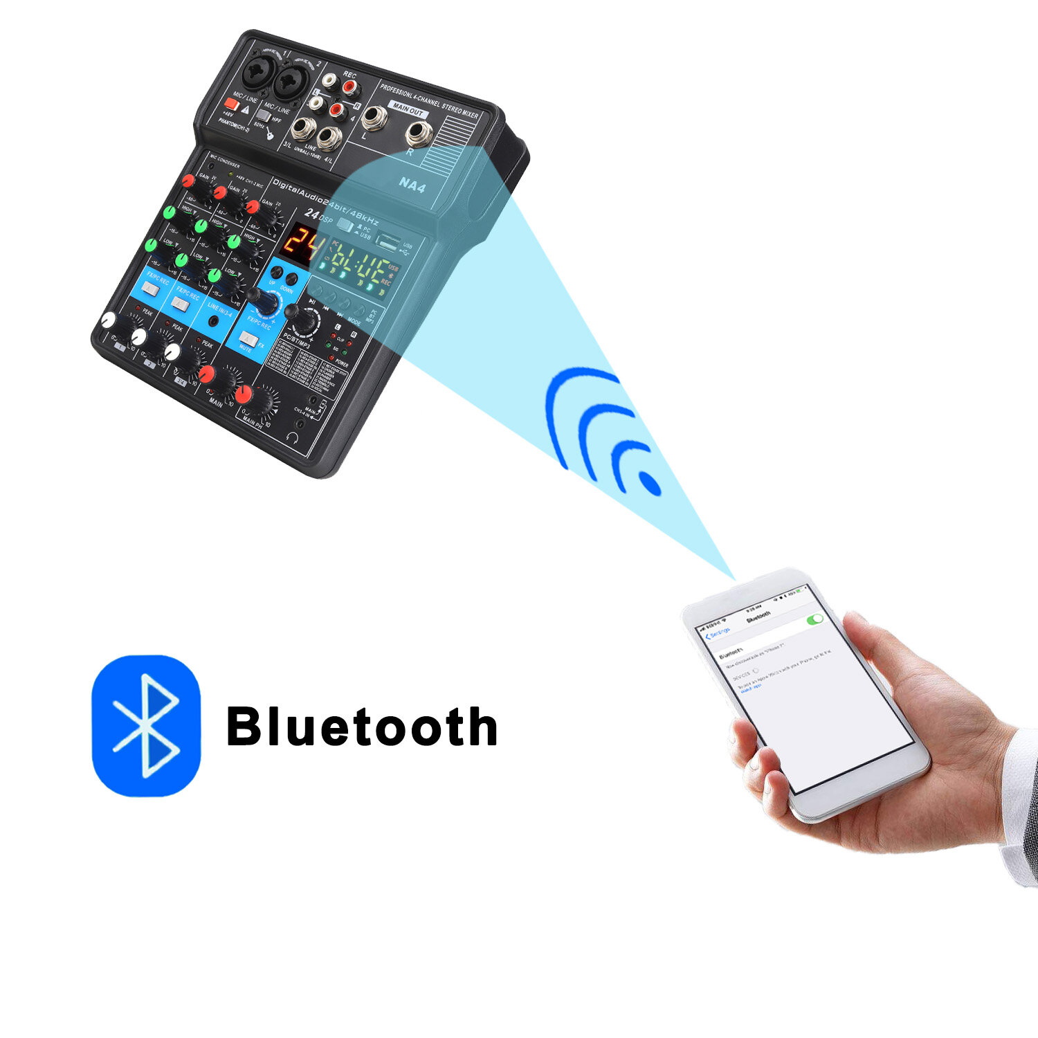 Купить 4-канальный микшер 48 В Bluetooth 24-канальный DSP-эффект USB компьютерная запись живой аудиомикшер NA4