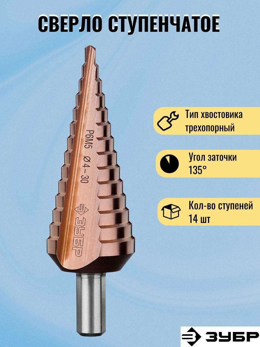 Купить Сверло ступенчатое по стали и цветным металлам кобальт ЗУБР 29672-4-30-14_z01