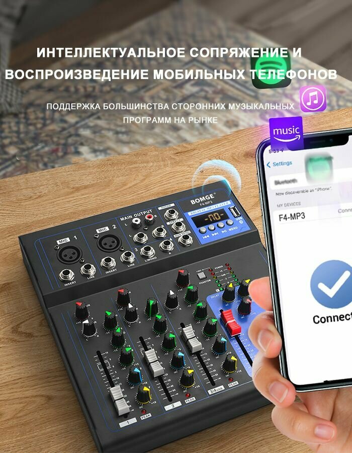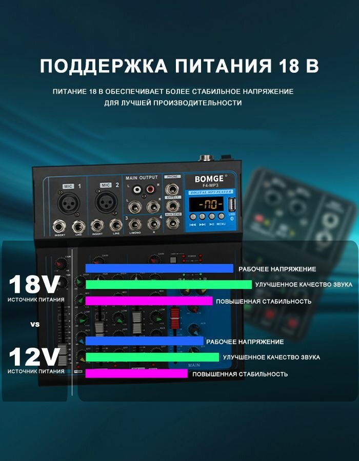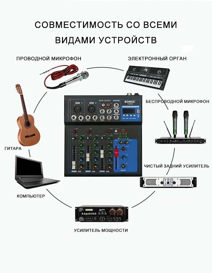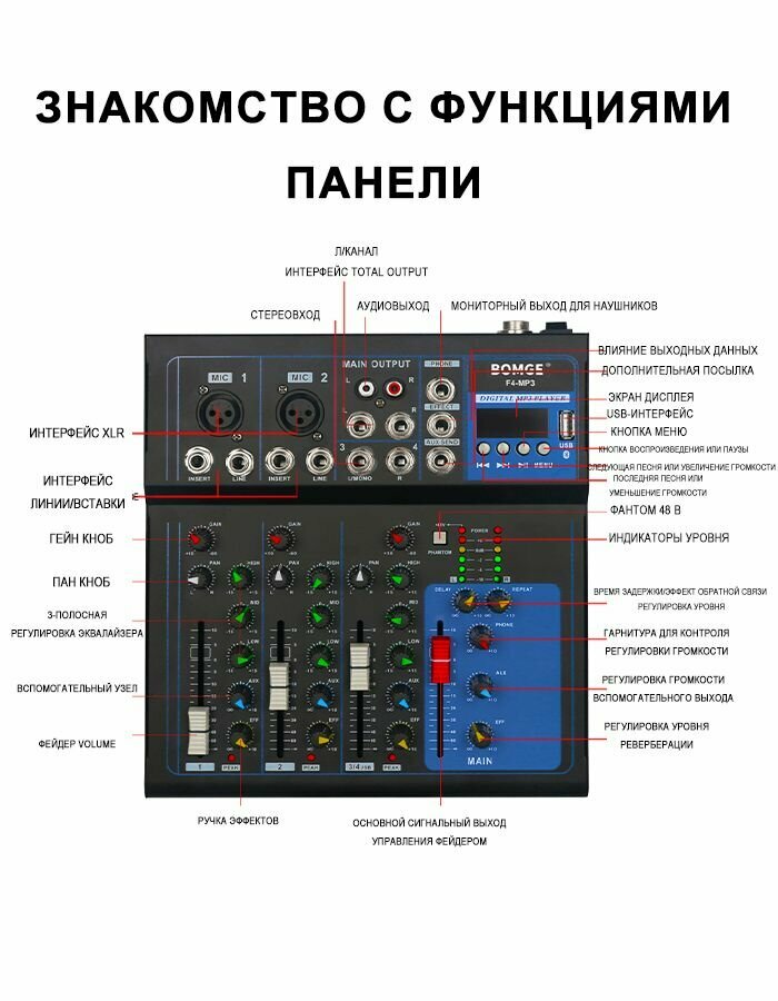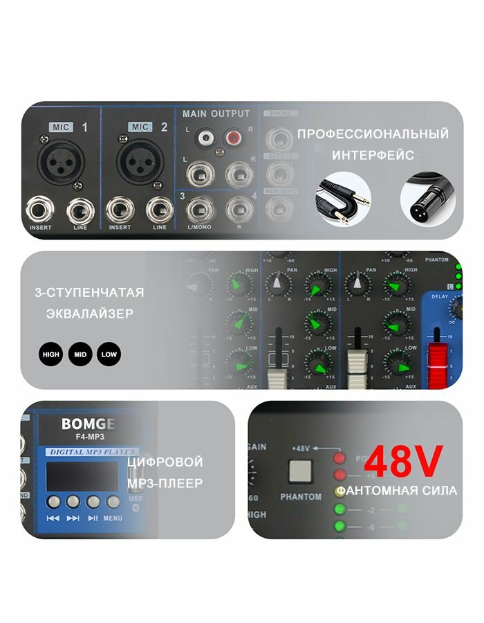 4-канальный микшер BOMGE F4 с цифровым MP3-входом, интерфейсом USB, совместимым с Bluetooth интересное:
