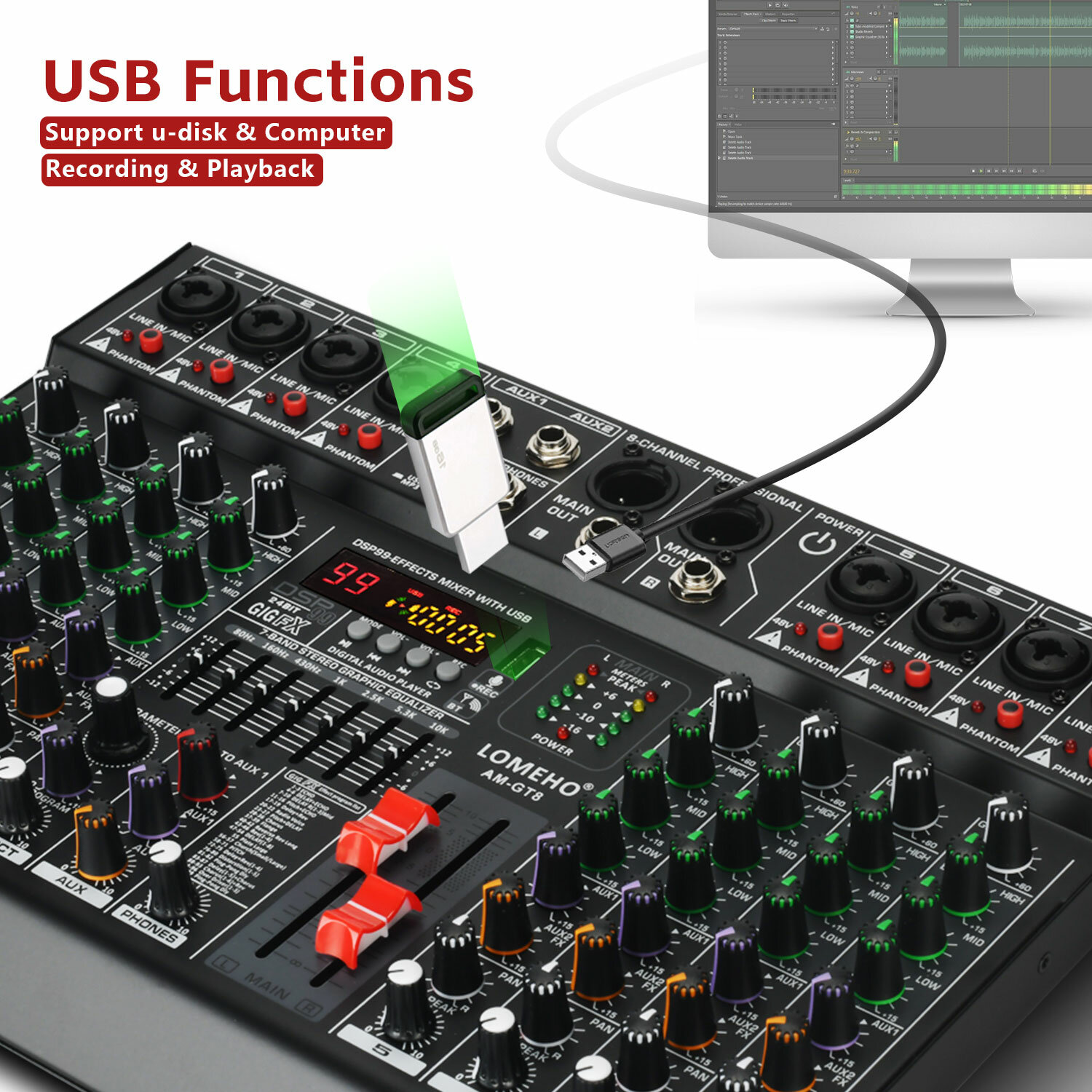 Ниже Вы можете прочитать отзывы на LOMEHO микшерный пульт 8-канальный аудиомикшер 99 эффектов 7-полосный эквалайзер 2 AUX 48 В USB Bluetooth DJ AM-GT8, ознакомится с подробными характеристиками, посмотреть интересные обзоры и фотографии на LOMEHO микшерный пульт 8-канальный аудиомикшер 99 эффектов 7-полосный эквалайзер 2 AUX 48 В USB Bluetooth DJ AM-GT8.