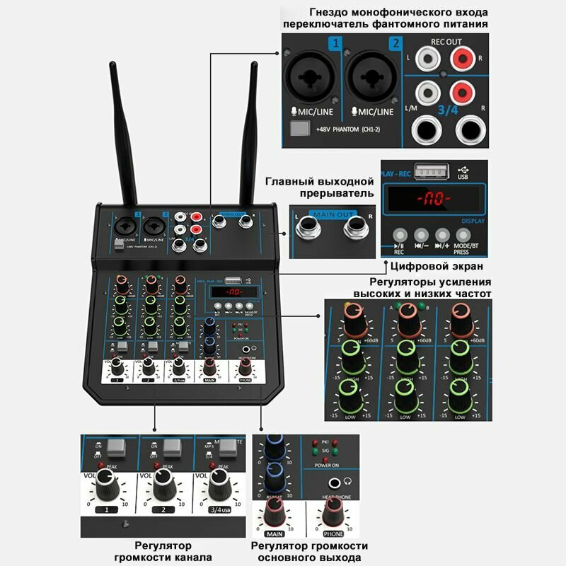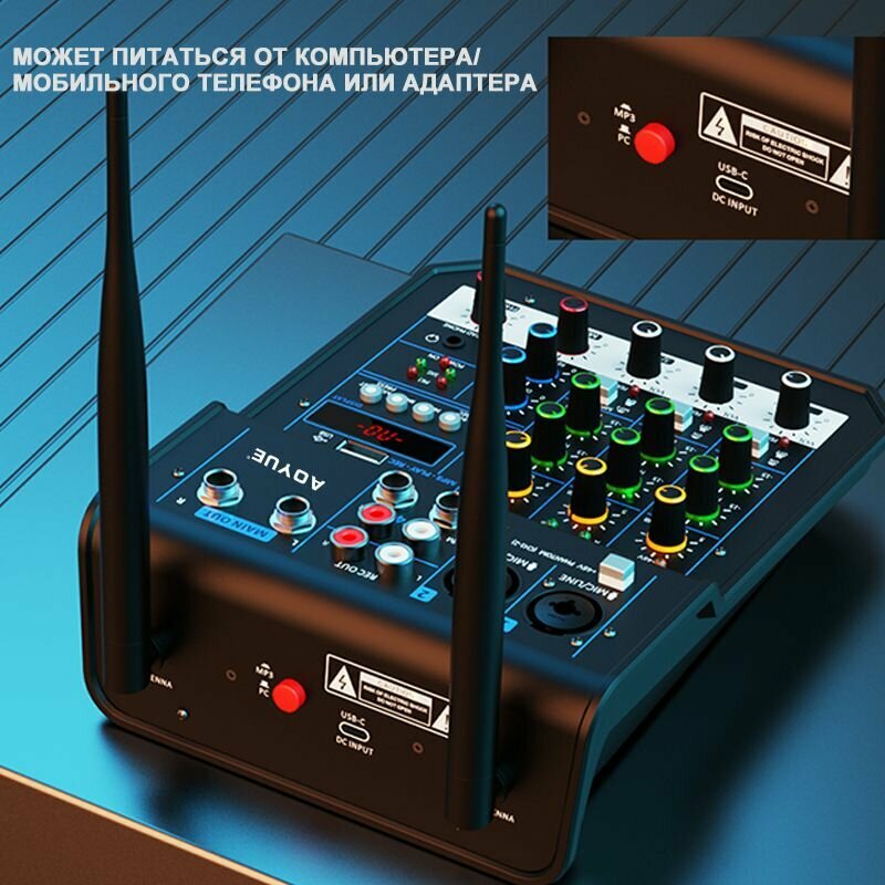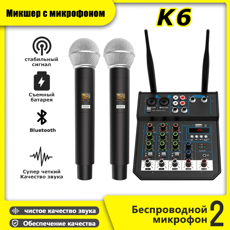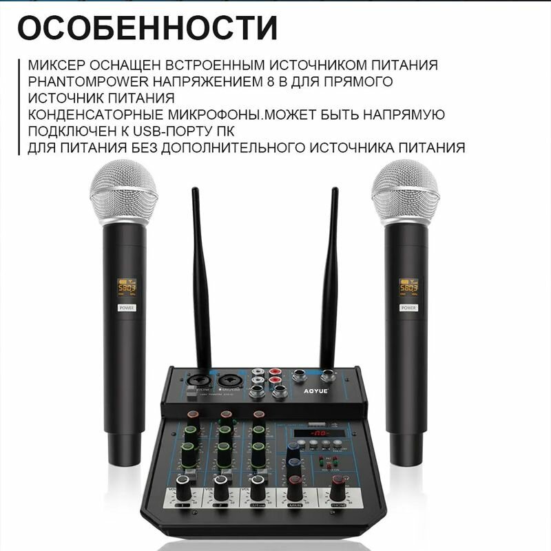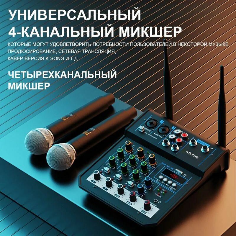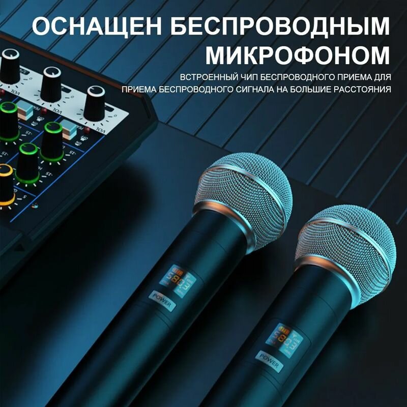 Микшер 4-полосный с беспроводными микрофонами с Bluetooth и USB Устройство применяется для организации караоке вечеринки в домашних условиях. интересное: