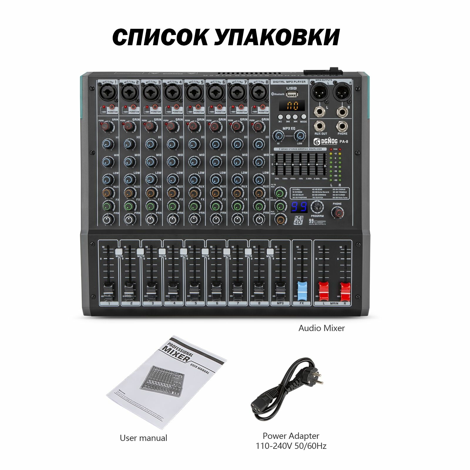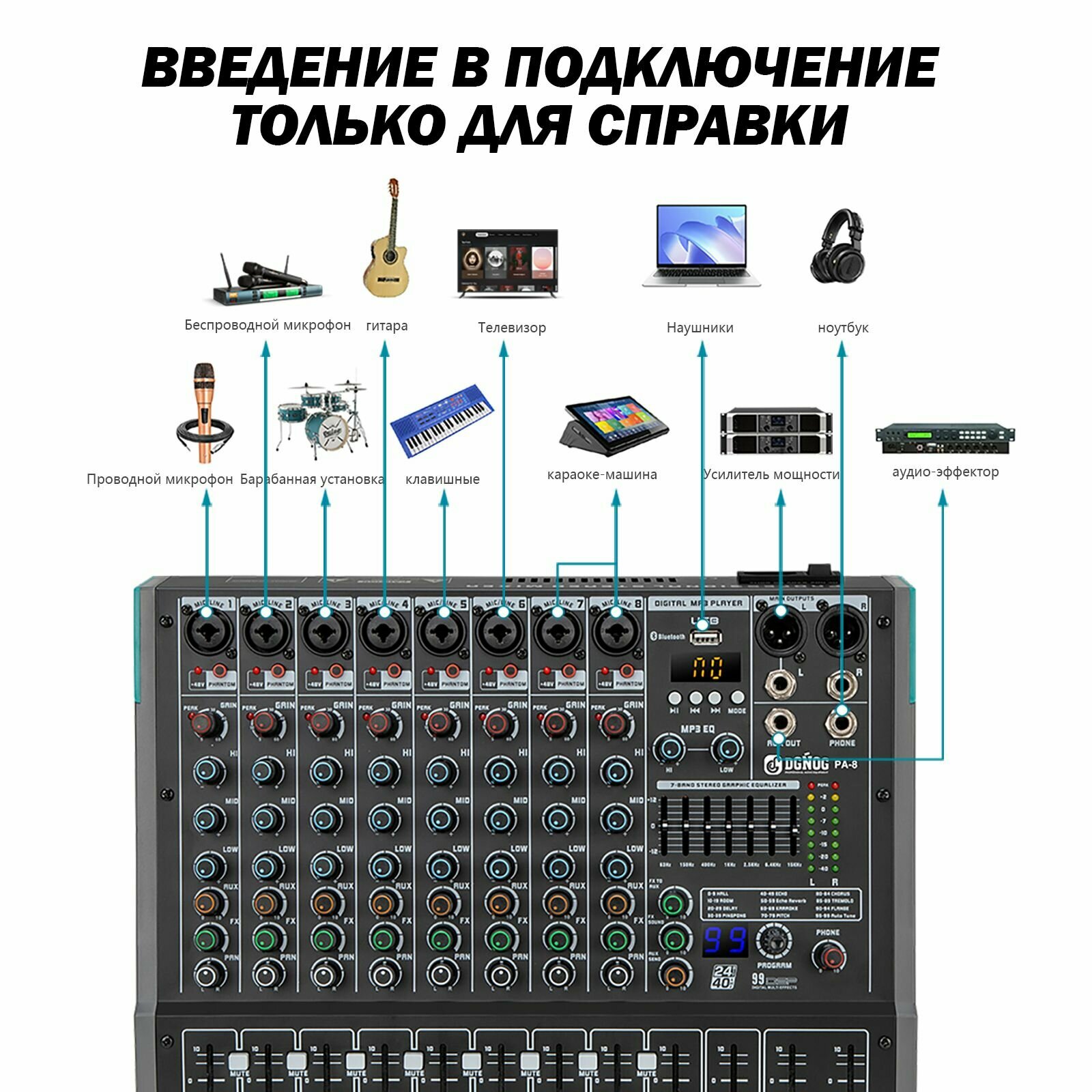 Микшер DGNOG, PA-8, аналоговый, 8 каналов, фантомное +48В, Bluetooth, чёрный интересное: