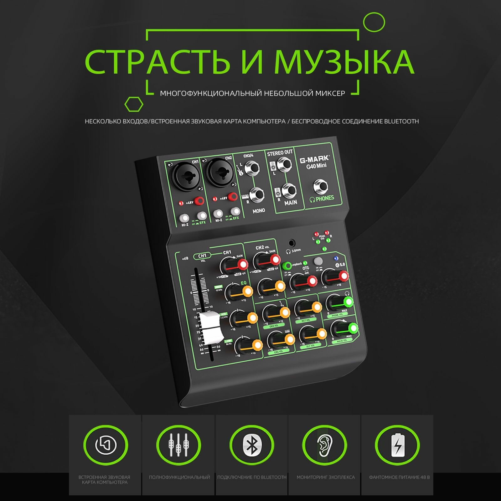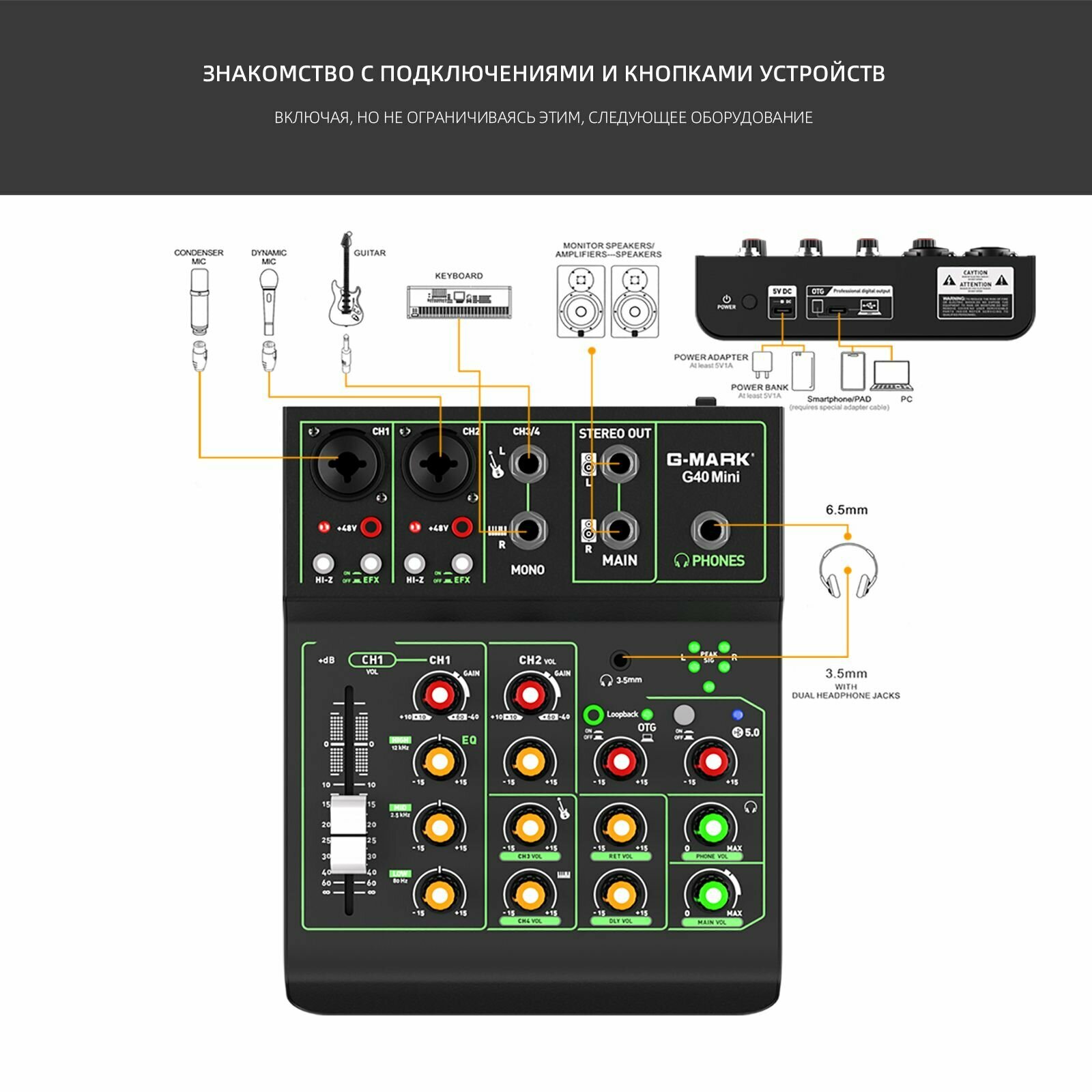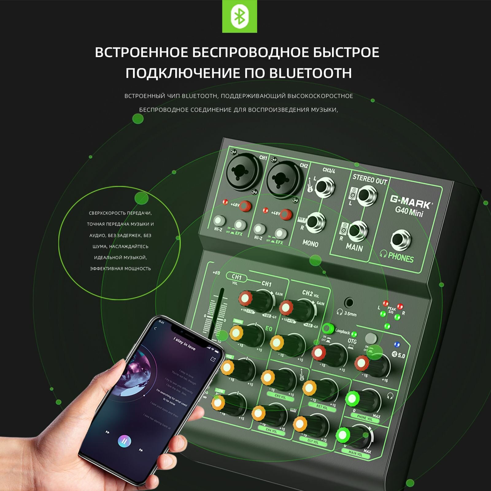 Аудиомикшер G-MARK OTG G40 Mini Metal с функцией повтора задержки включения Bluetooth 48 В интересное: