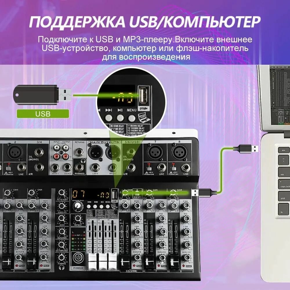 Аудиомикшер 8-канальный микшерный пульт Bluetooth Звуковая плата USB интересное: