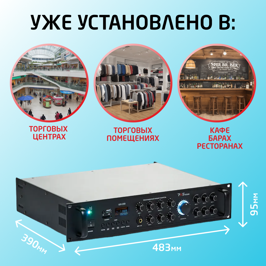 Музыкальный трансляционный микшер-усилитель 350 Вт 6 зон с MP3-Bluetooth-FM плеером PASystem LEV-350 интересное: