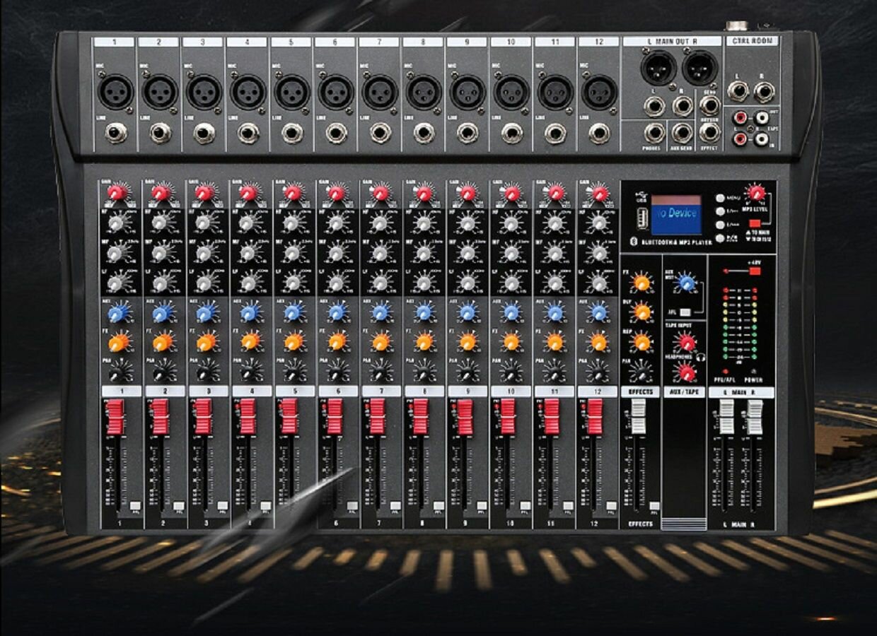 Профессиональный микшерный пульт 12 - ти канальный J. I. Y. черный интересное: