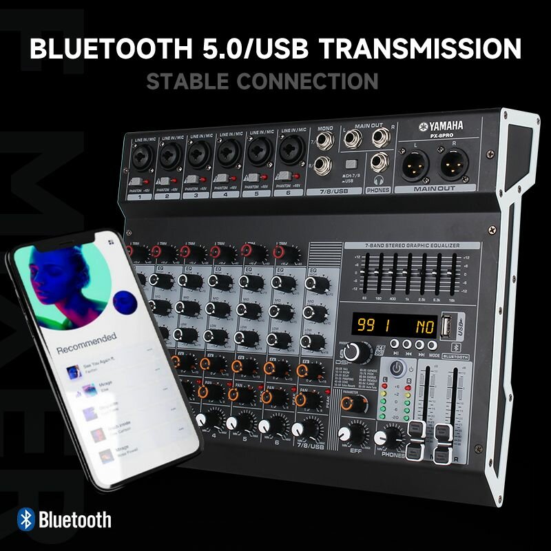 YAMAHA Mixer PX-8PRO 8-канальный аудиомиксер с 7-диапазонным эквалайзером, 99 DSP эффектов, + 48V фантомное питание, поддержка Bluetooth/USB/MP3 воспроизведения