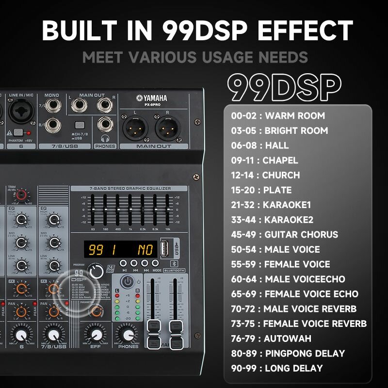 YAMAHA Mixer PX-8PRO 8-канальный аудиомиксер с 7-диапазонным эквалайзером, 99 DSP эффектов, + 48V фантомное питание, поддержка Bluetooth/USB/MP3 воспроизведения