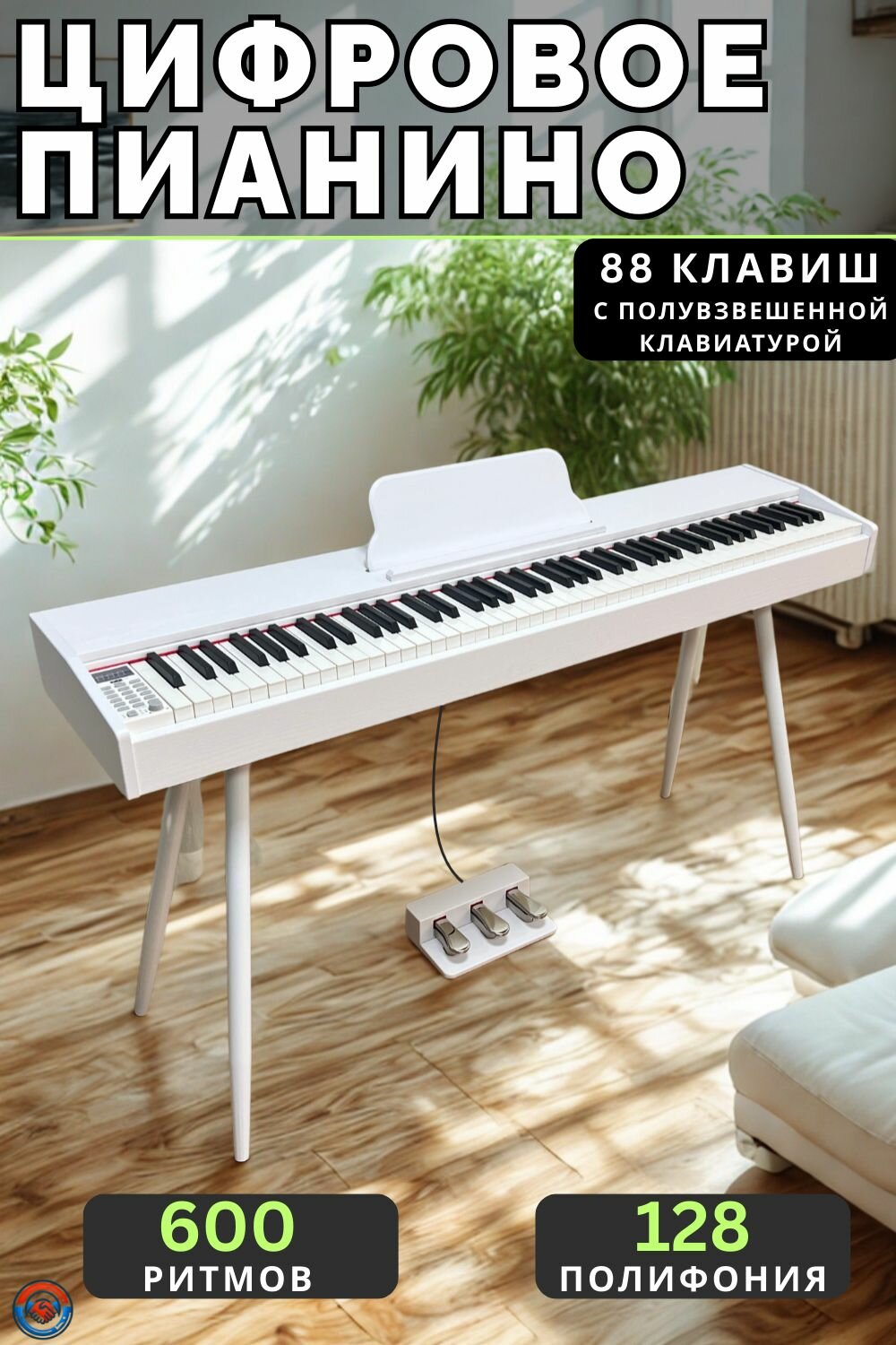Цифровое пианино 88 клавиш bluetooth, 880 тембров, 600 ритмов, три педали, деревянный корпус, MIDI/USB, белое интересное: