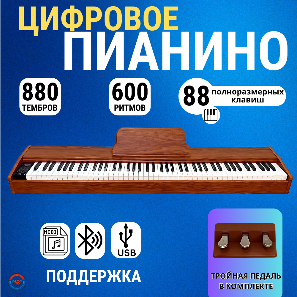 Цифровое пианино 88 клавиш с Bluetooth и MIDI/USB, 880 тембров и 600 ритмов, три педали, деревянный корпус, коричневый интересное: