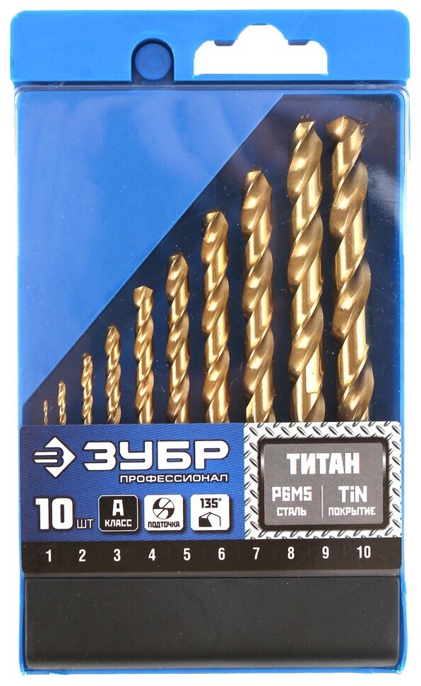 Купить ЗУБР титан 10шт(1-10мм), Набор сверл по металлу, сталь Р6М5, класс А , титиновое покрытие