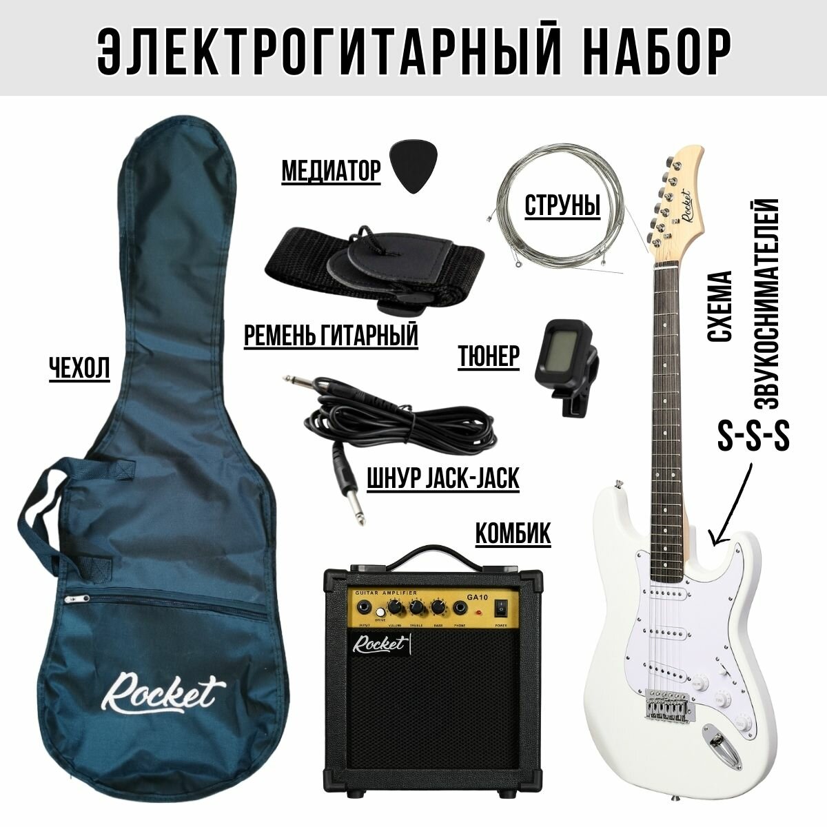 Электрогитарный набор ROCKET PACK-1 WH комплект с электрогитарой Stratocaster цвет белый и аксессуары интересное: