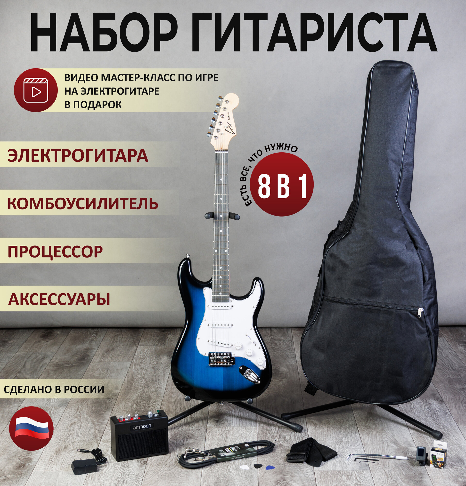 Комплект 8 в 1 Электрогитара с комбоусилителем, Lexguitar Stratocaster Blue Sunberst интересное: