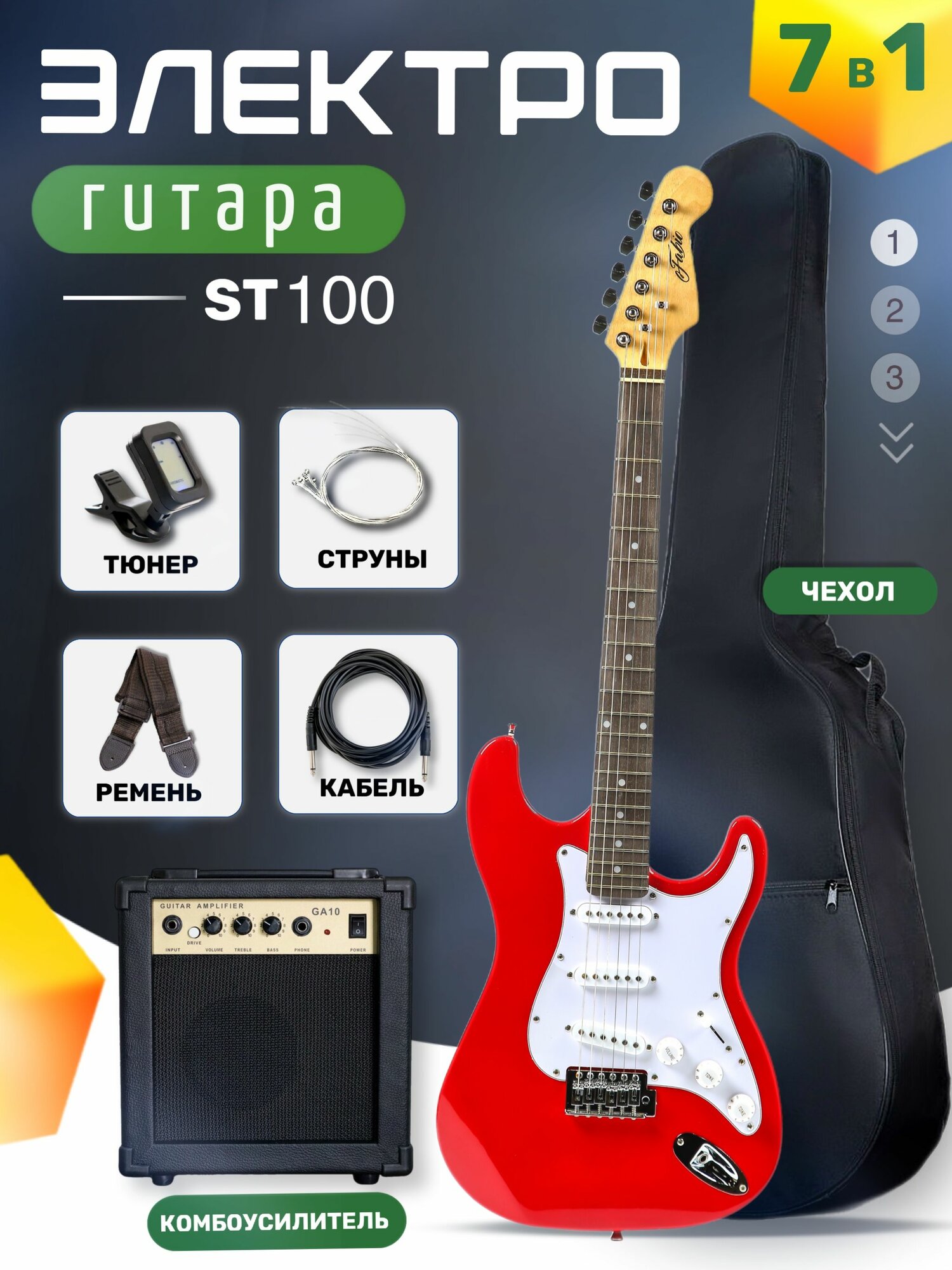 Электрогитара Stratocaster Красная Fabio ST100 RDS S-S-S, 1V+2T (Набор электрогитары с комбоусилитем)