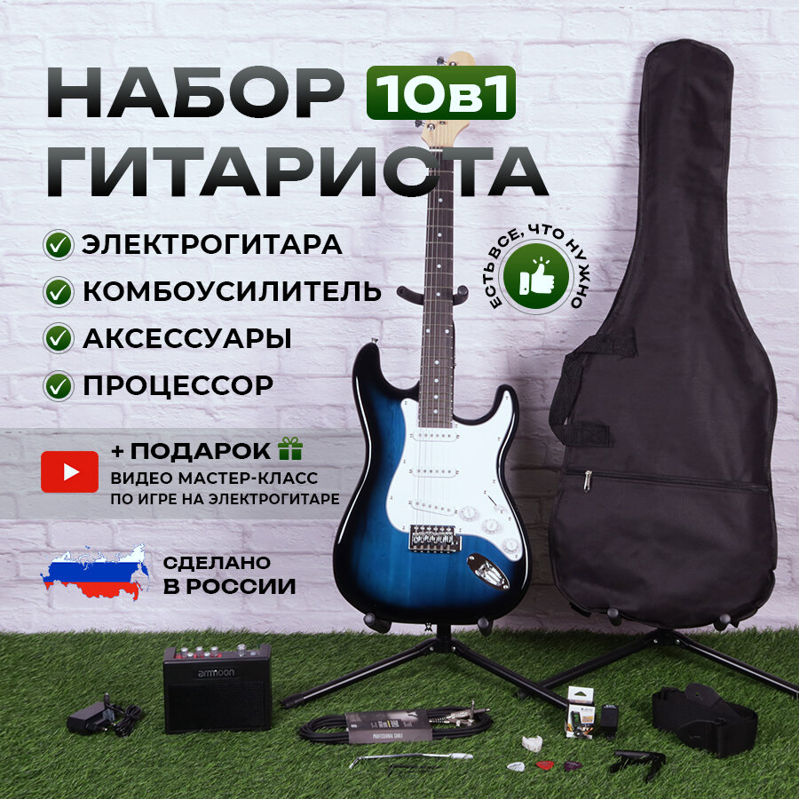 Комплект 10 в 1 Электрогитара с комбоусилителем, Lexguitar Stratocaster Blue Sunberst интересное:
