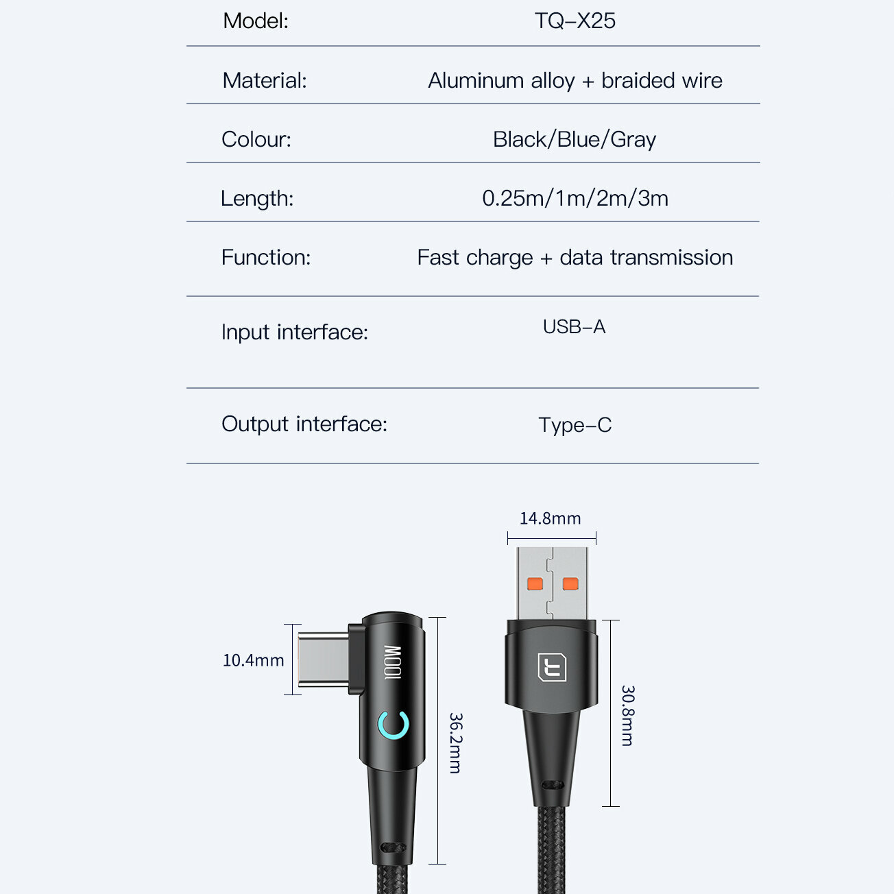 Купить Кабель USB-A на угловой Type-C, Toocki, 100 Вт, 6A интеллектуальный индикатор, быстрая зарядка