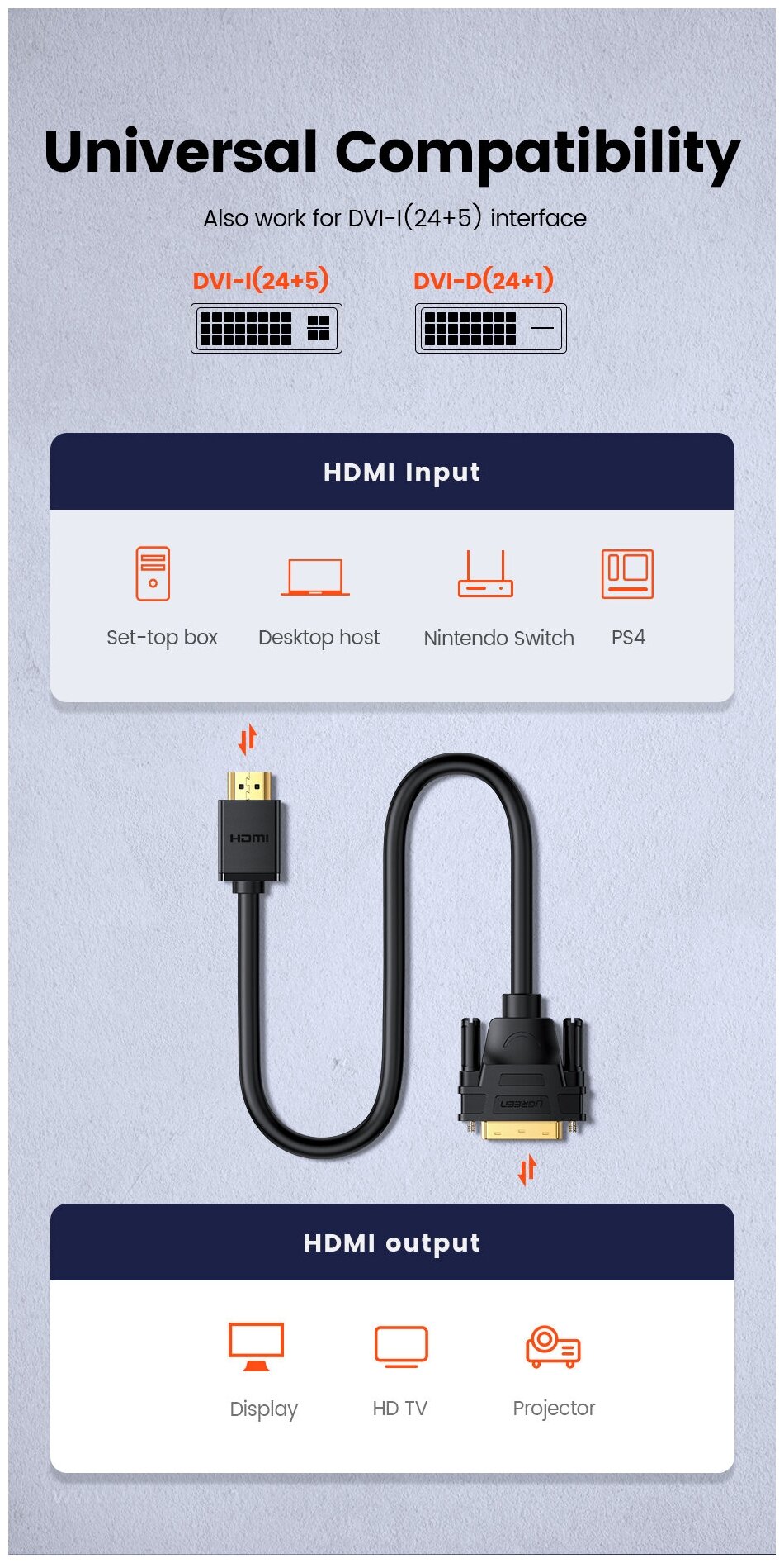 Кабель Ugreen HDMI - DVI-D (24+1), 30 AWG, OD 7,3 мм, 1080 60ц, 5 м (10137)