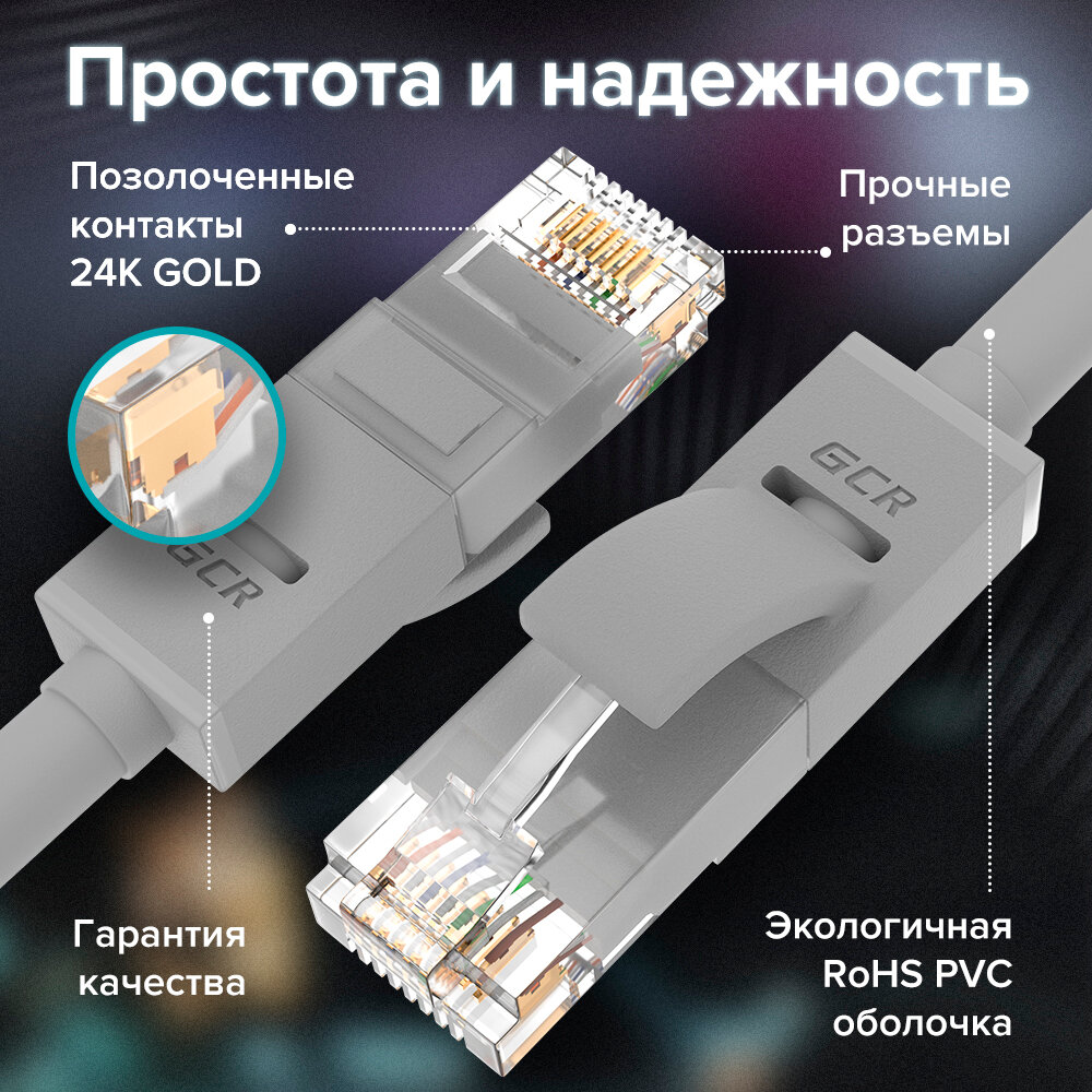 Патч-корд UTP cat.5e 1 Гбит/с RJ45 LAN CCA компьютерный кабель для интернета контакты 24K GOLD (GCR-LNC500) серый 10.0м