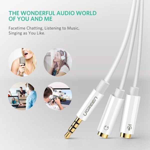 Купить Переходник Ugreen AV141-10789 AUX 3.5mm (M) to 2 AUX 3.5mm (F), Mic + Earphone 0,2м, White