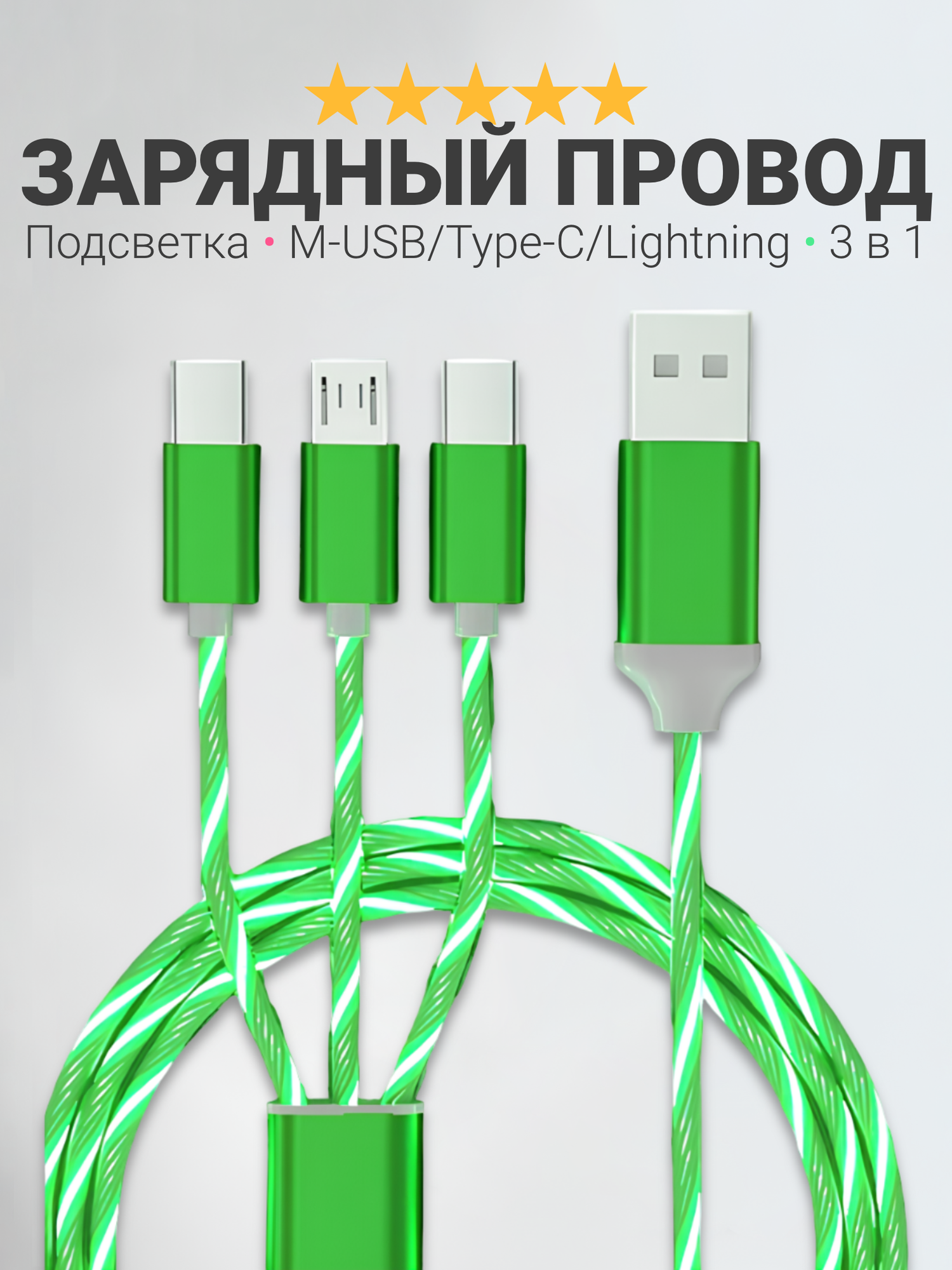 Зарядный кабель для iPhone, Android, iPad, Xiaomi, Meizu, 3 в 1, Type-C, Micro-USB, Lightning, светящийся, зеленый интересное: