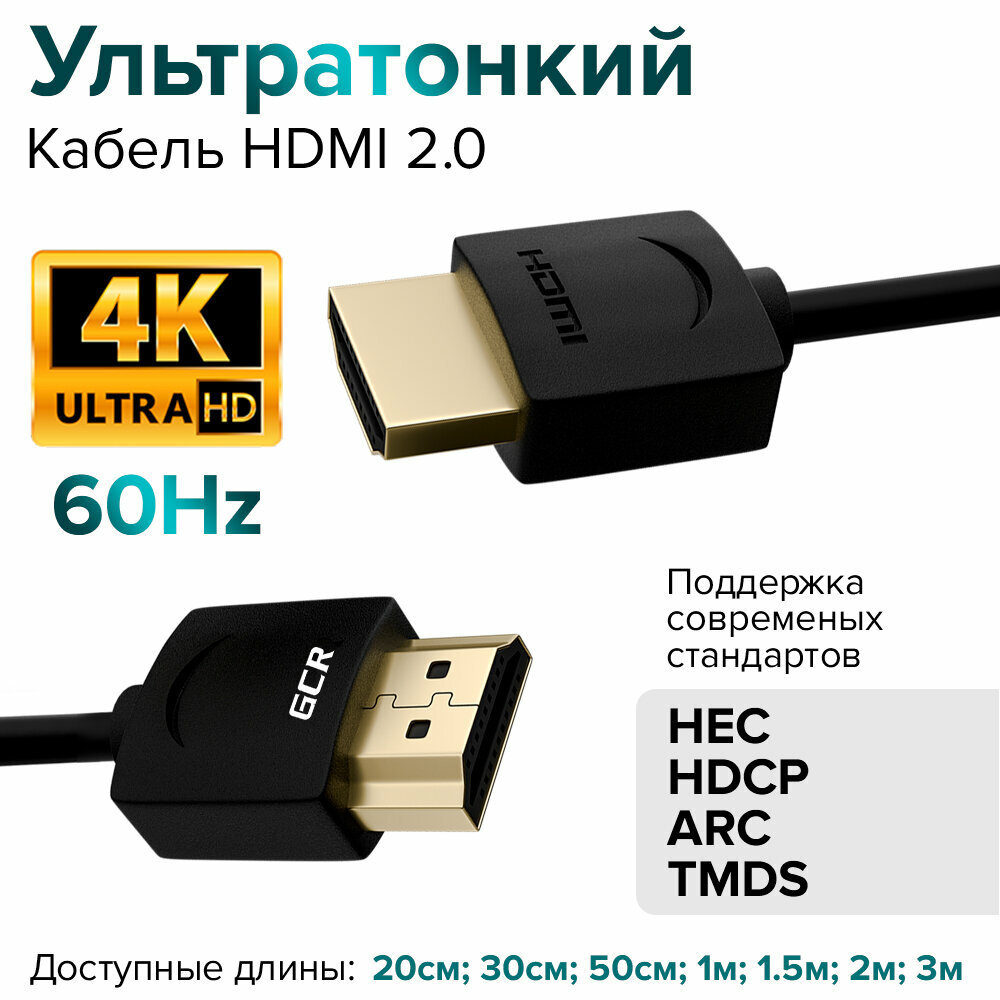 Кабель для телевизора 2м GCR SLIM HDMI 2.0 Ultra HD 4K 60Hz 3D 18.0 Гбит/с 24K GOLD