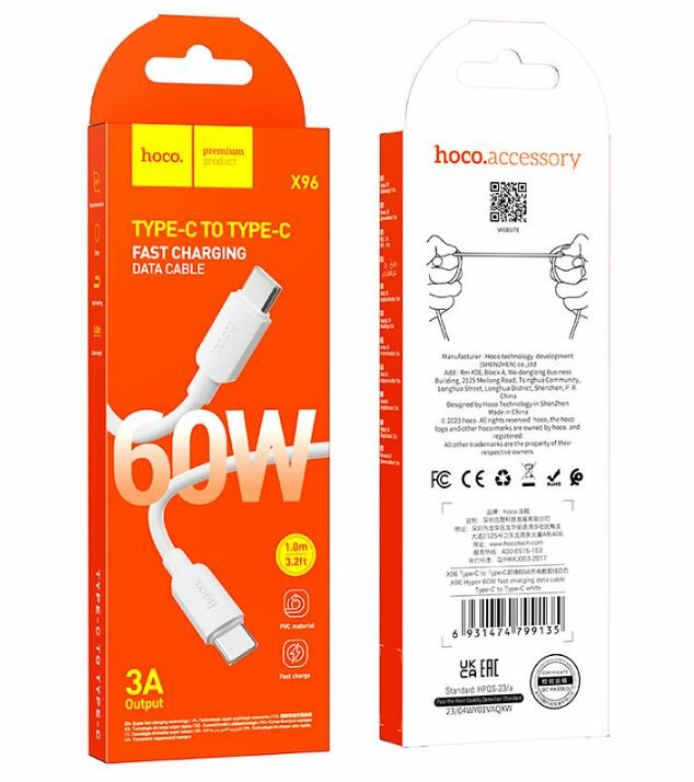 Кабель Type-C - Type-C HOCO X96 , 1.0м, 3A, 60Вт, цвет: белый интересное: