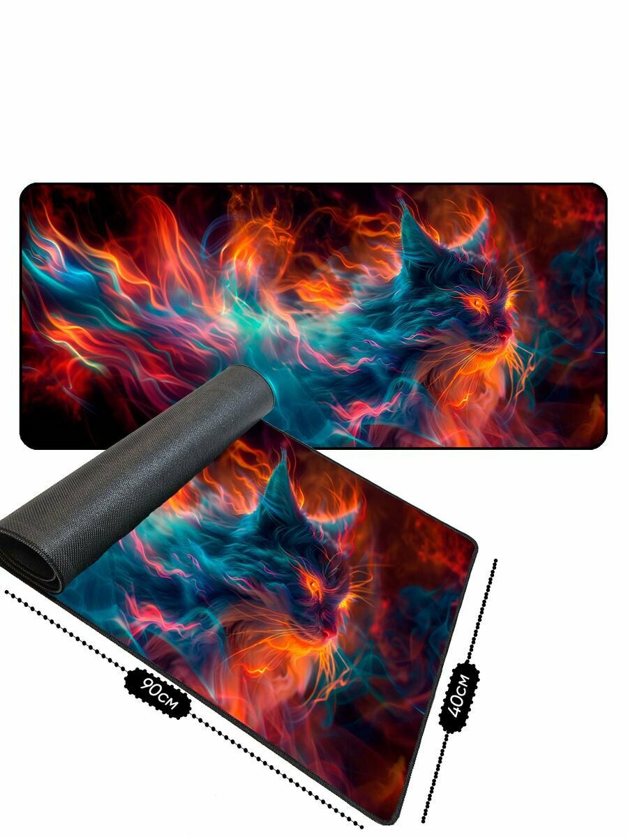 Купить Большой игровой коврик для мышки с принтом, 90х40 см, Мистический кот. Компьютерный ковер с 3D дизайном под клавиатуру и мышь на весь стол.