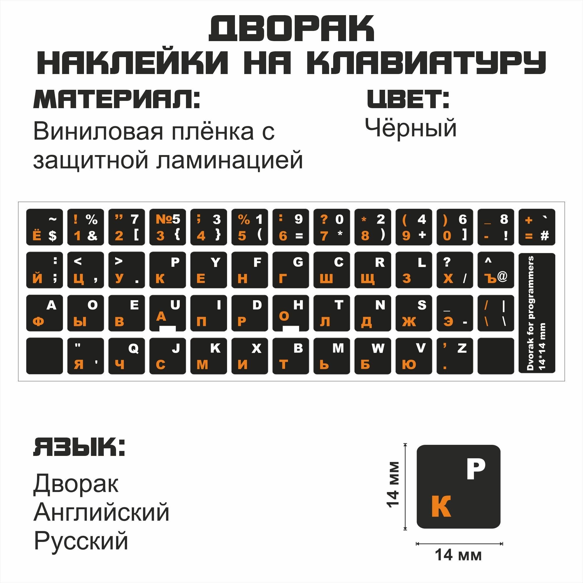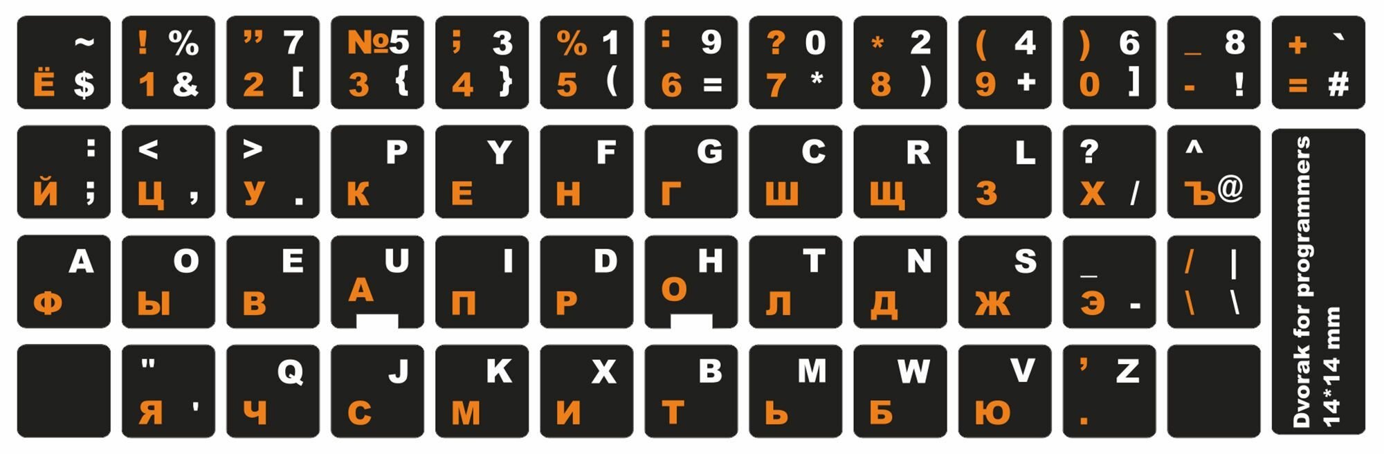 Раскладка дворака (Dvorak) для программистов русские и английские буквы на чёрном фоне 14*14 мм интересное: