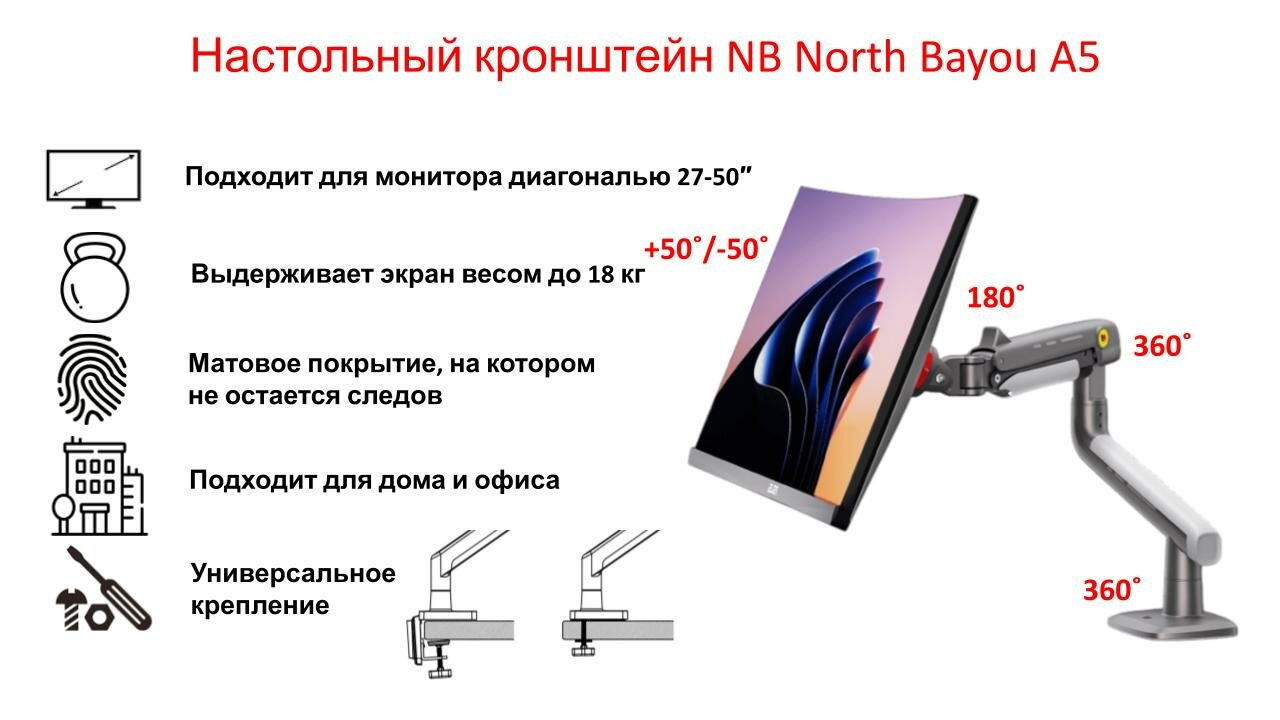 Настольный игровой кронштейн для монитора NB North Bayou A5, 27-50" до 18 кг, матовый черный интересное:
