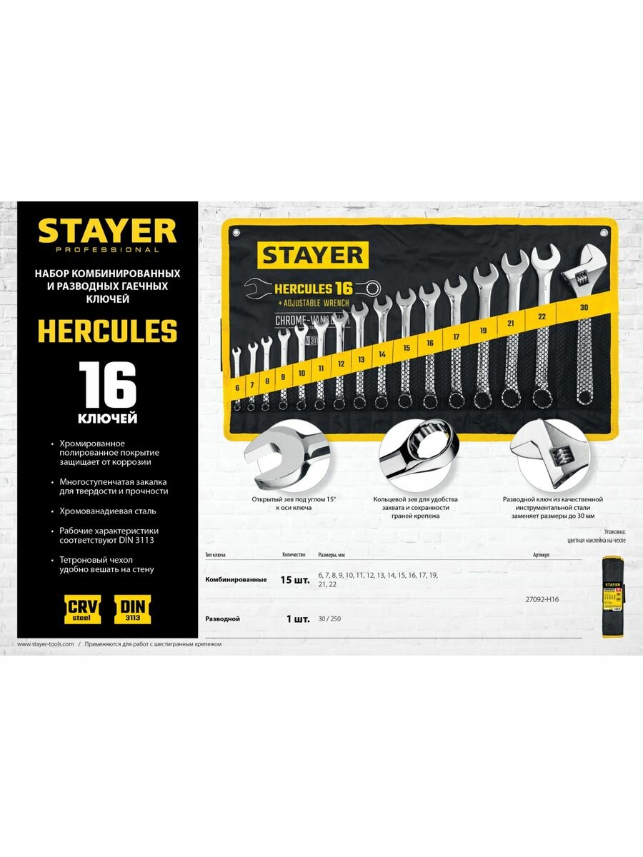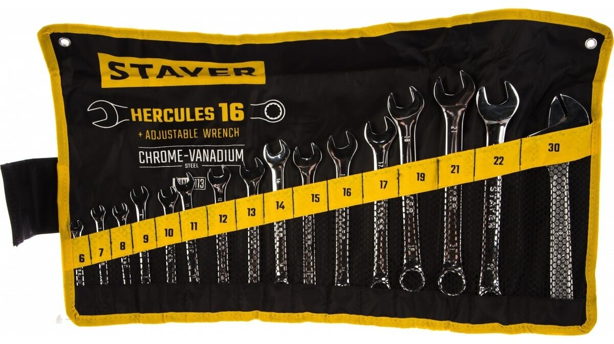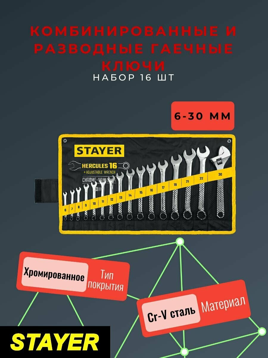 Набор комбинированных и разводных гаечных ключей STAYER HERCULES 16 шт 6-30 мм 27086-H16 (27092-H16)