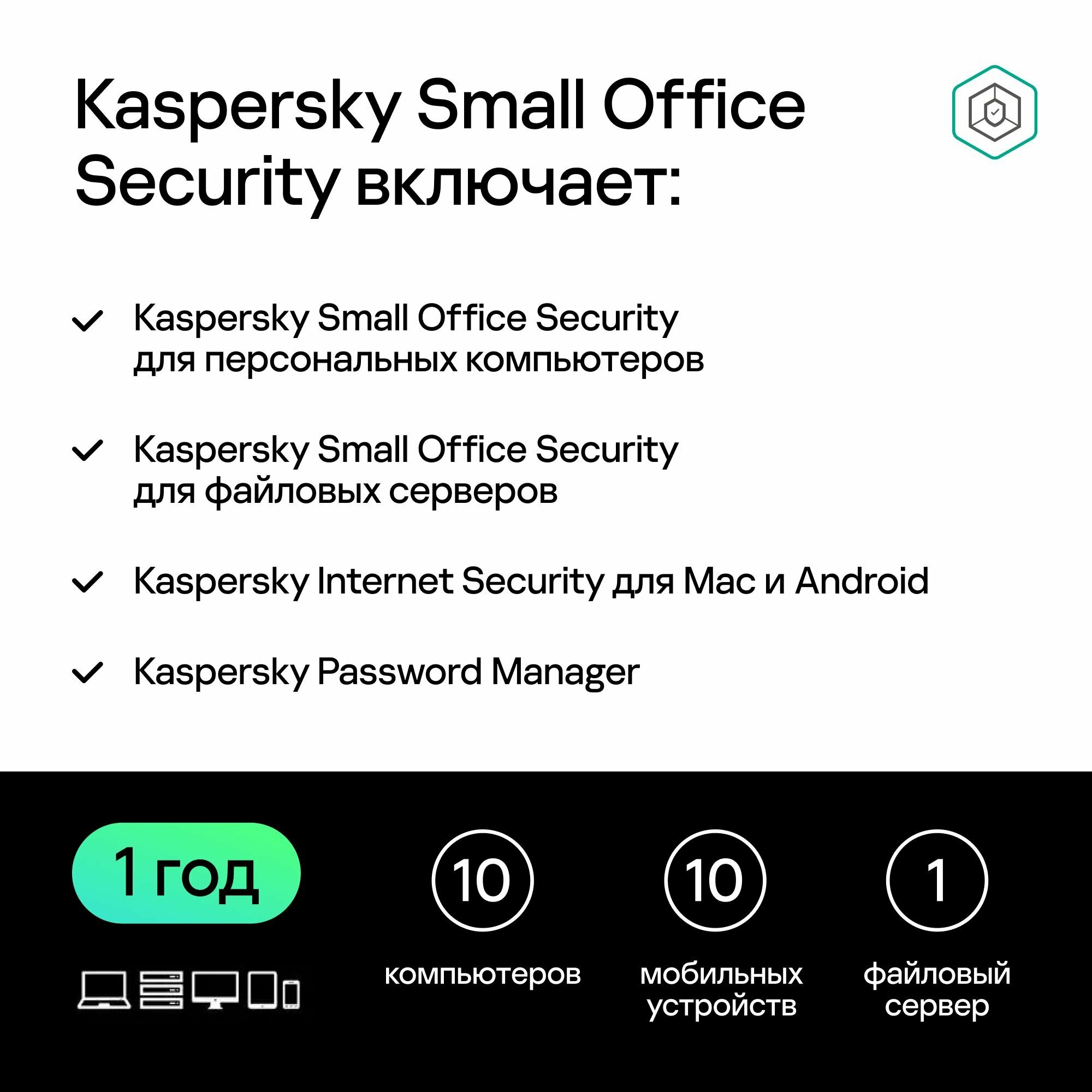 Купить Kaspersky Small Office Security (10 компьютеров, 10 мобильных устройств, 1 файловый сервер, 1 год)
