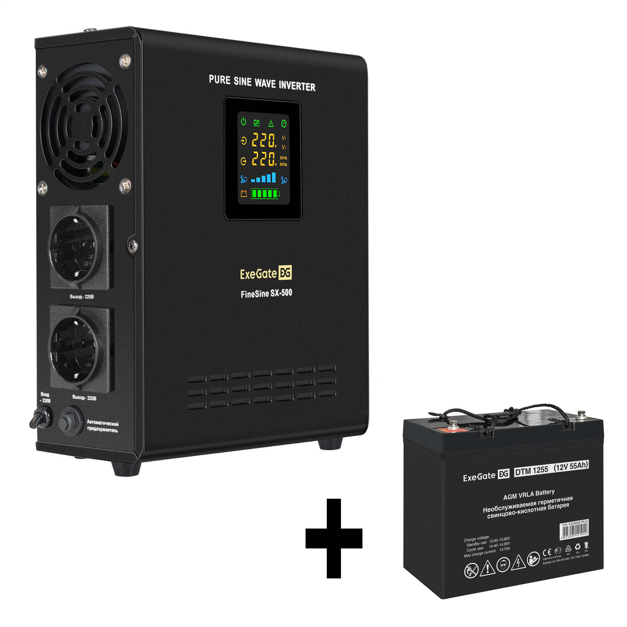 Купить Комплект ИБП ExeGate FineSine SX-500. LCD. AVR.2SH + батарея ExeGate DTM 1255 (12В, 55Ач) 1шт EX296500RUS