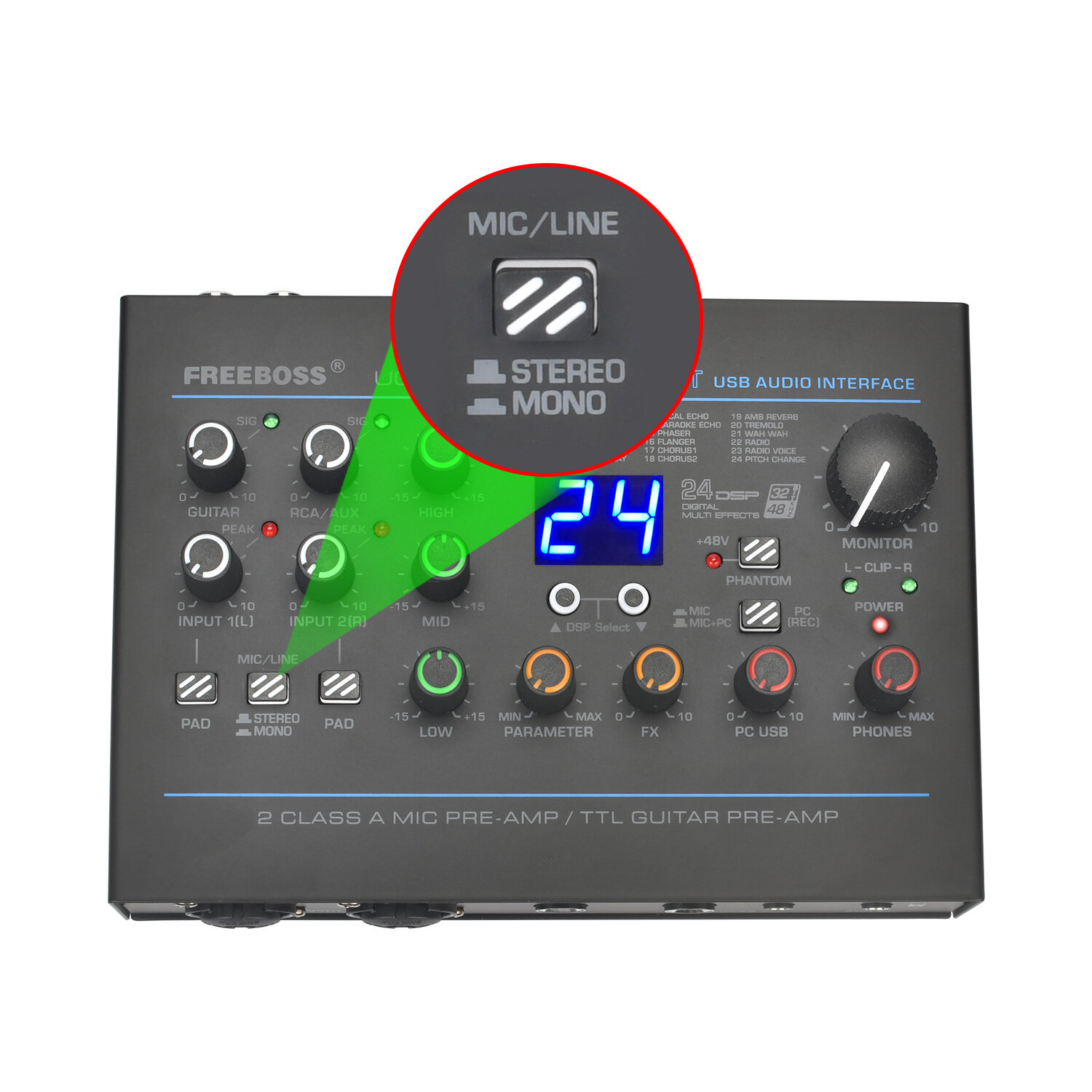 Купить Аудиоинтерфейс с 24 эффектами 48 кГц 3-полосный эквалайзер 48 В внешняя студийная гитарная звуковая карта для записи