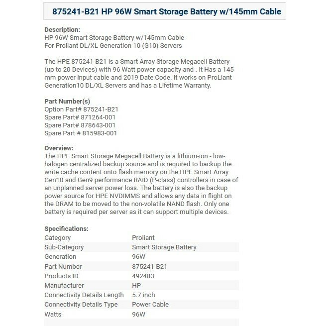 Батарея HP 875241-B21 96W P-class Smart Storage Battery w/145mm Cable 871264-001 878643-001 815983-001 для серверов Proliant DL/XL Gen10 875241-B21 интересное: