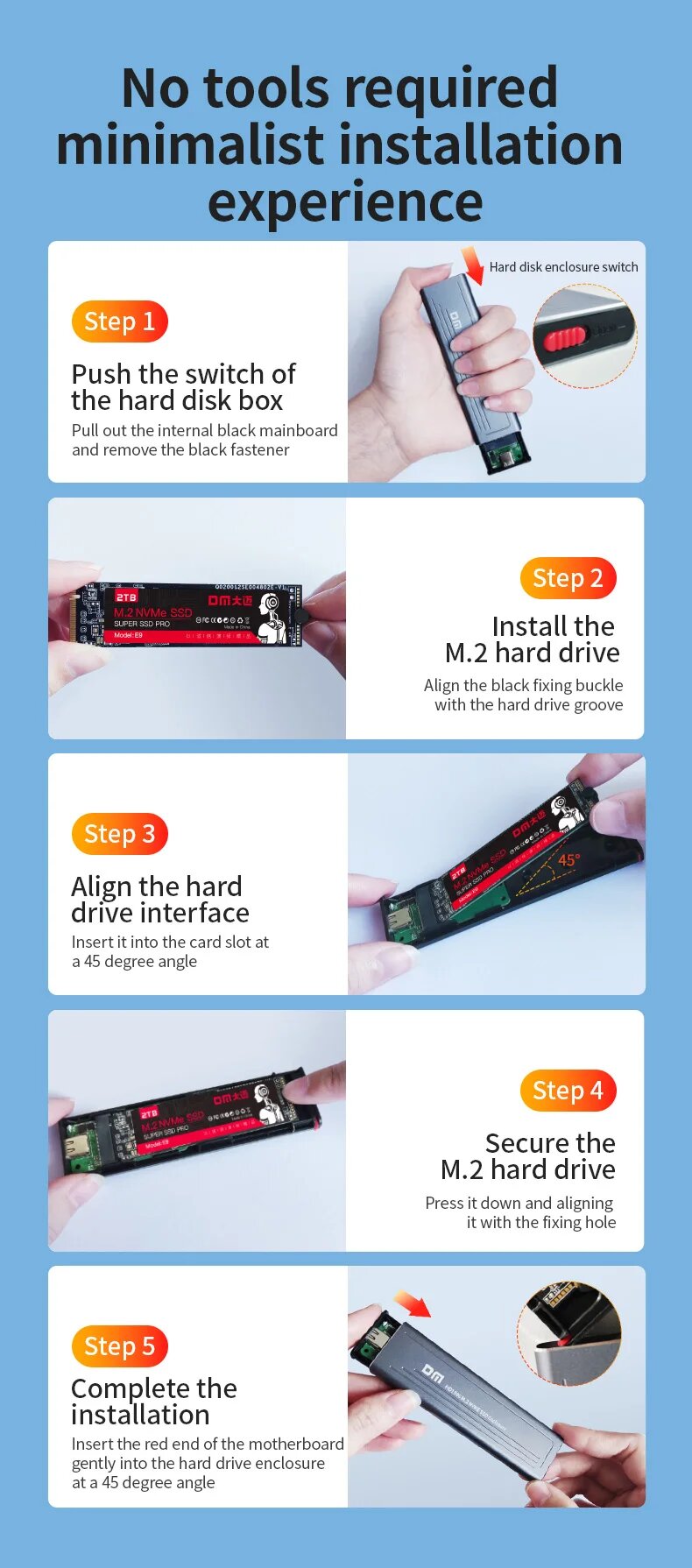 Купить Корпус DM HD1500 USB 3.2 Gen2 M.2 NVMe — двойной протокол 10 Гбит/с, прозрачный корпус с RGB-подсветкой, Plug & Play