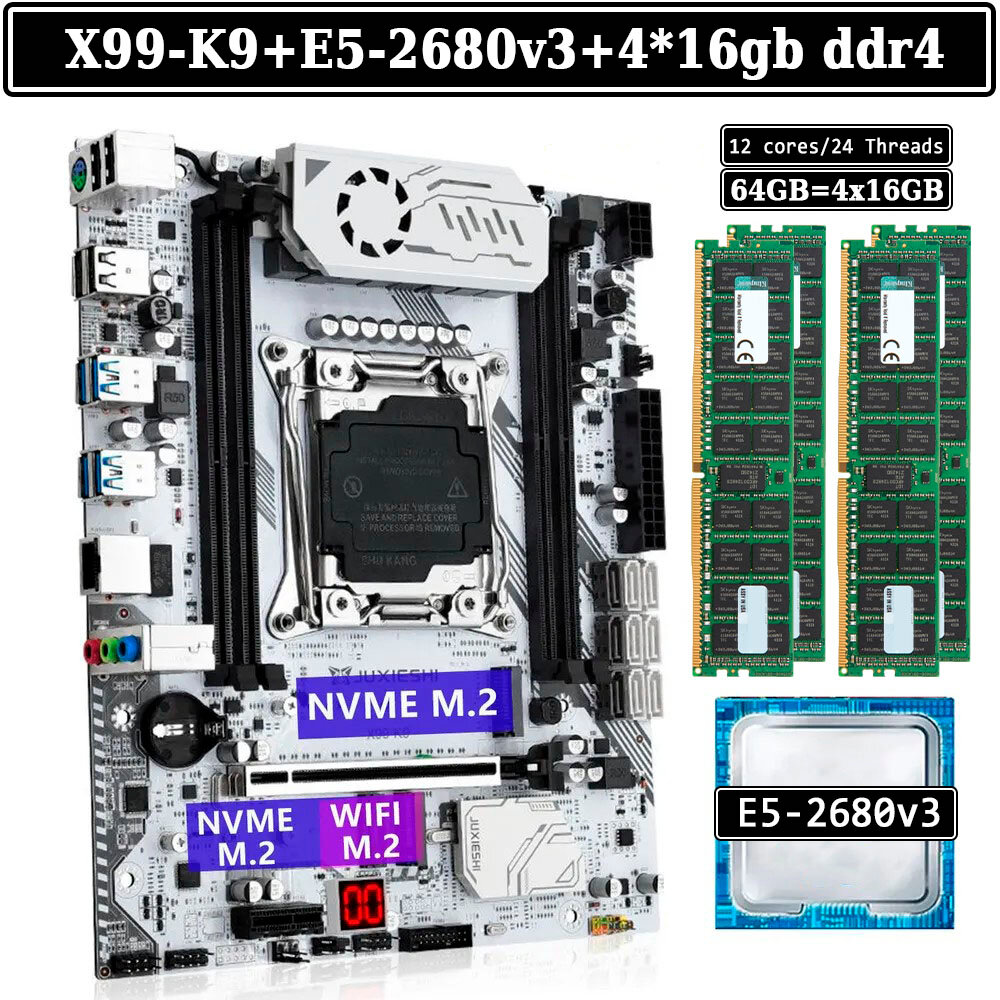 Купить Комплект материнская плата Juxieshi X99-K9 + Xeon 2680V3 + 64GB DDR4 4x16gb