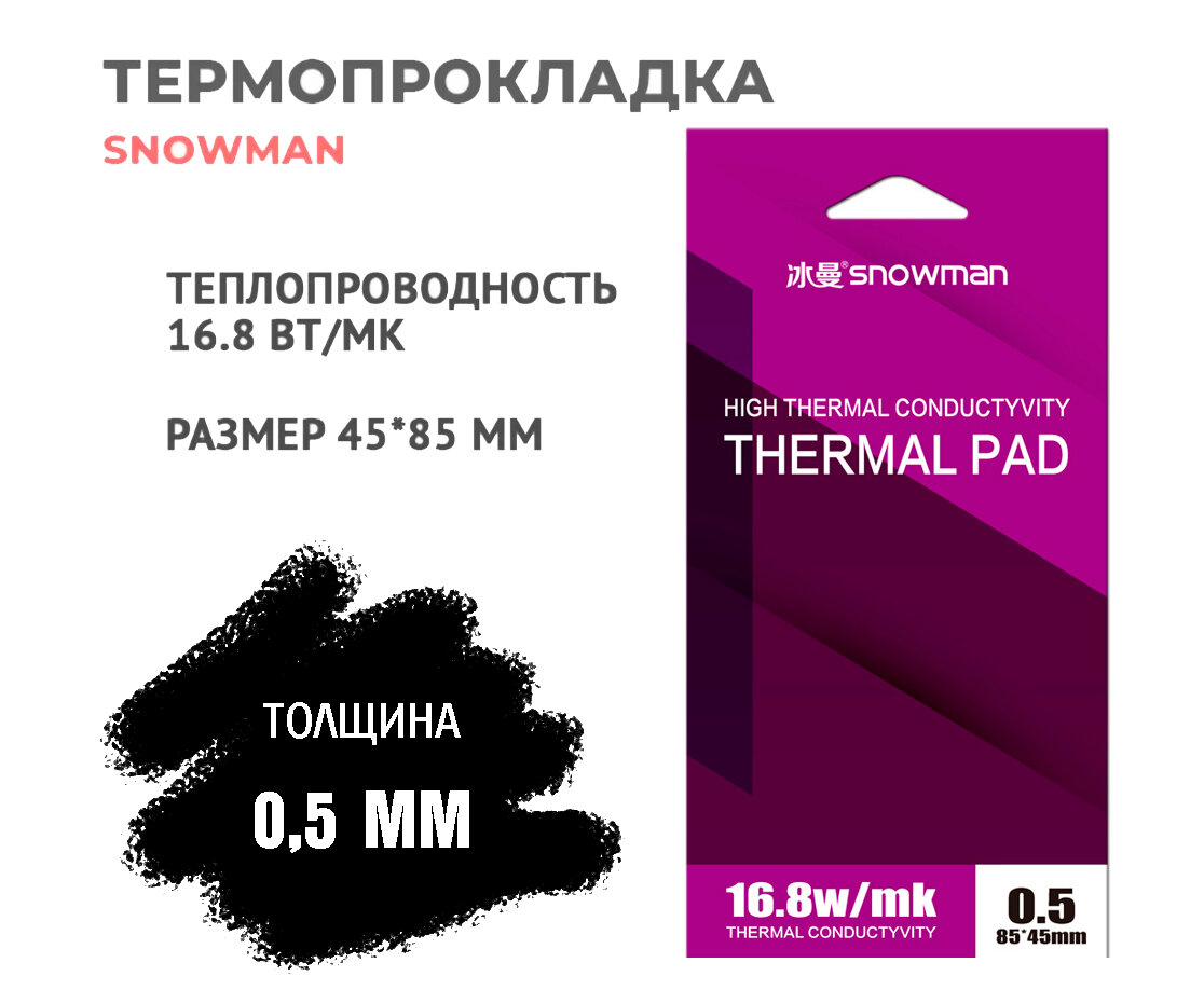 Термопрокладка силиконовая Snowman 16,8 Вт 0,5мм для рассеивания тепла процессора/графического процессора, 85*45мм, 0,5мм интересное:
