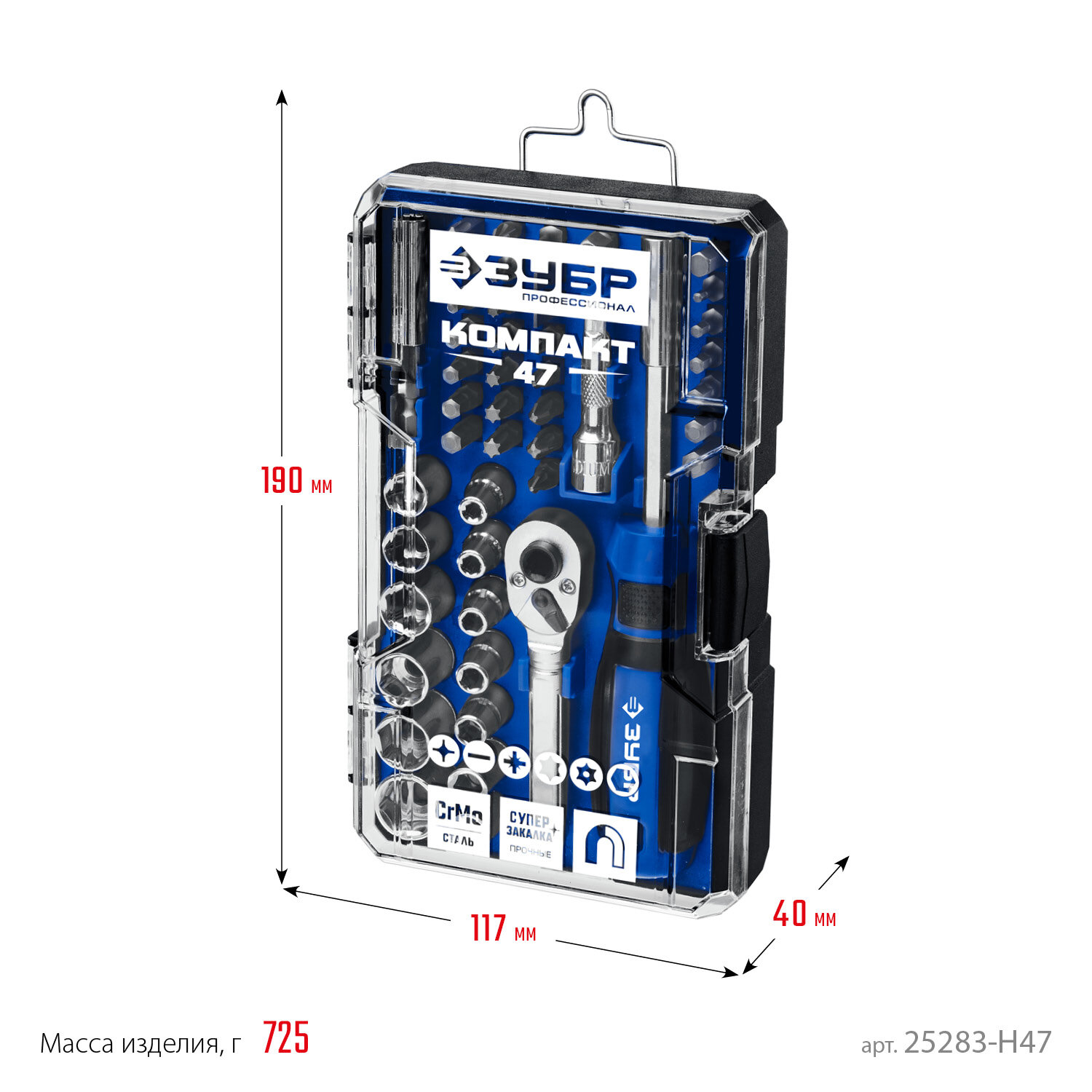 | Дополнительная информация | комплектация: магнитный адаптер 60 мм, торцевые головки, адаптер для торцевых головок, отвертка с битодержателем T-образная, отвертка с битодержателем реверсивная футляр |