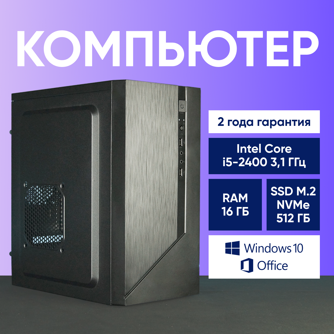 Системный блок Компьютер офисный ПК (Intel Core i5-2400 (3.4 ГГц), RAM 16 ГБ, SSD 512 ГБ, Windows 10), черный матовый