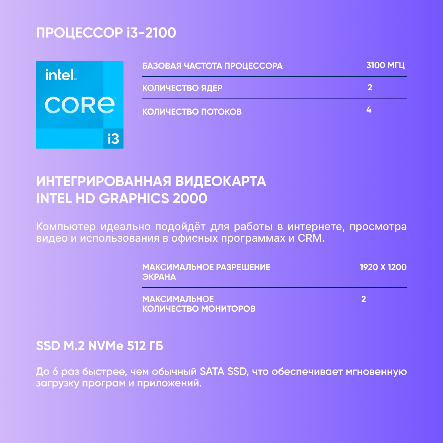 Системный блок Компьютер Офисный ПК (Intel Core i3-2100 (3.1 ГГц), RAM 8 ГБ, SSD 512ГБ, Windows 10), чёрный матовый