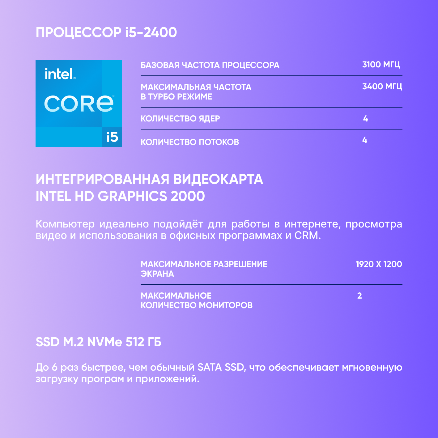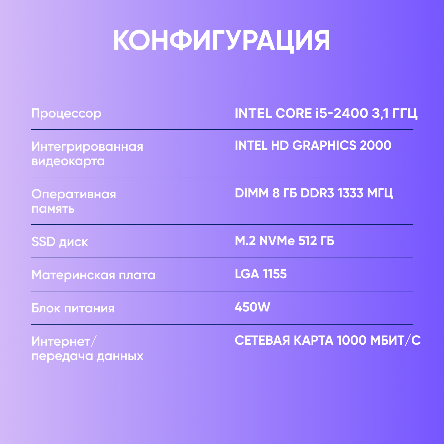 Системный блок Компьютер офисный ПК (Intel Core i5-2400 (3.4 ГГц), RAM 8 ГБ, SSD 512 ГБ, Windows 10), черный матовый