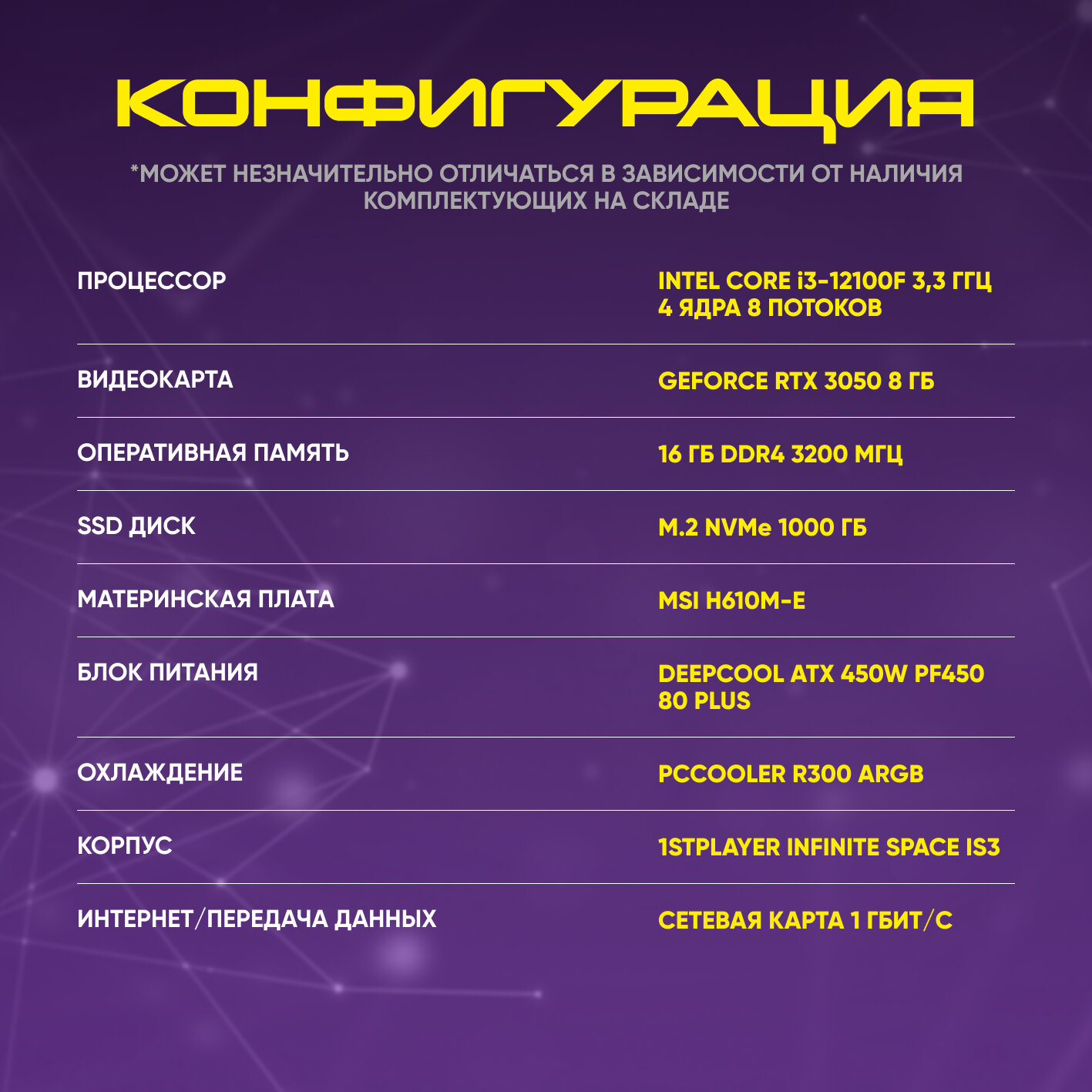 Купить Игровой компьютер (Intel Core i3-12100F (3.3 ГГц), RAM 16 ГБ, SSD 1000 ГБ, RTX 3050 8 ГБ, Windows 11), черный матовый