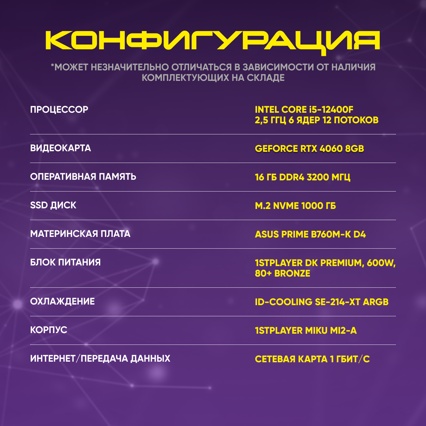 Игровой компьютер (Intel Core i5-12400F (2.5 ГГц), RAM 16 ГБ, SSD 1000 ГБ, RTX 3050 8 ГБ, Windows 11), черный матовый