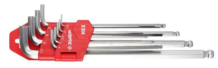 Набор ключей Зубр "Мастер" имбусовые длинные с шариком Cr-V HEX 1,5-10 мм 9 предметов, 27461-2_z02