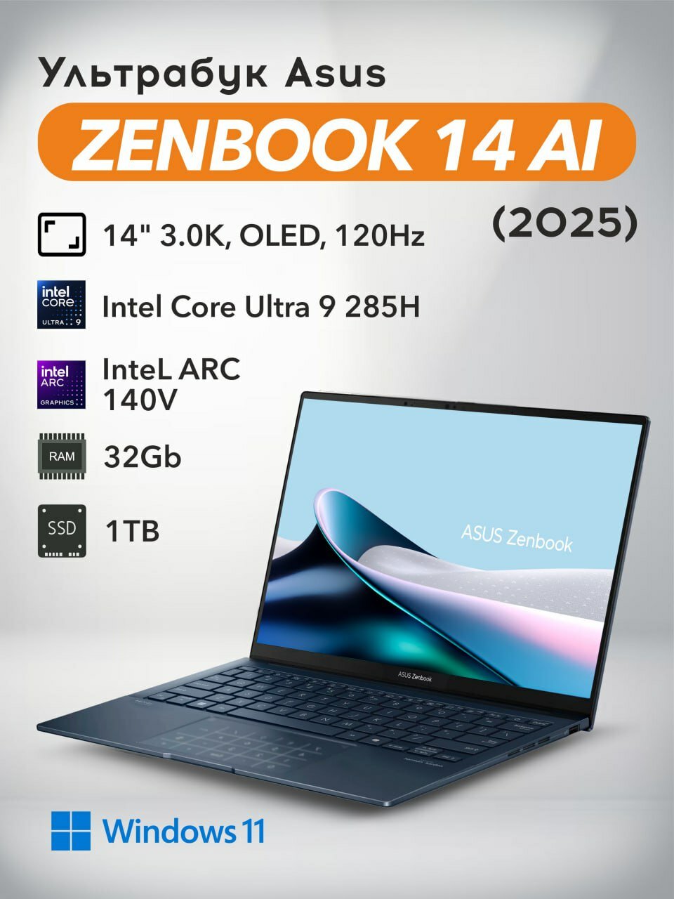Купить Ультрабук Asus Zenbook 14 AI (2025) / Intel Ultra 9 285H / 3.0K 120Hz OLED/ 32GB + 1TB/ Win 11 RU/ клавиатура RU
