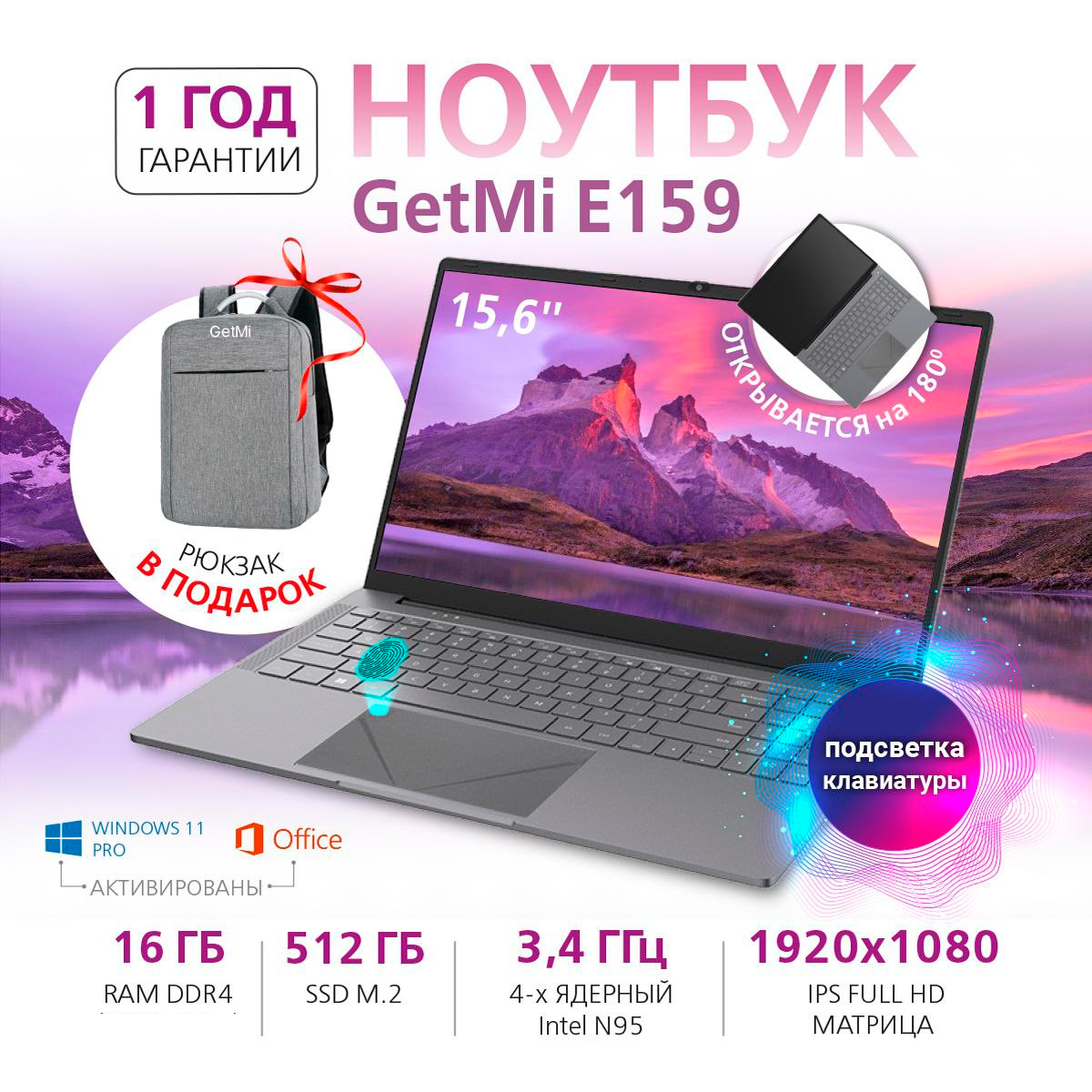 Ноутбук GetMi E159 15,6 Intel N95 (3.4 GHz, 4 ядра), DDR4 16 GB, SSD. M2 512 GB, Windows 11 Pro для работы, учебы и игр. интересное: